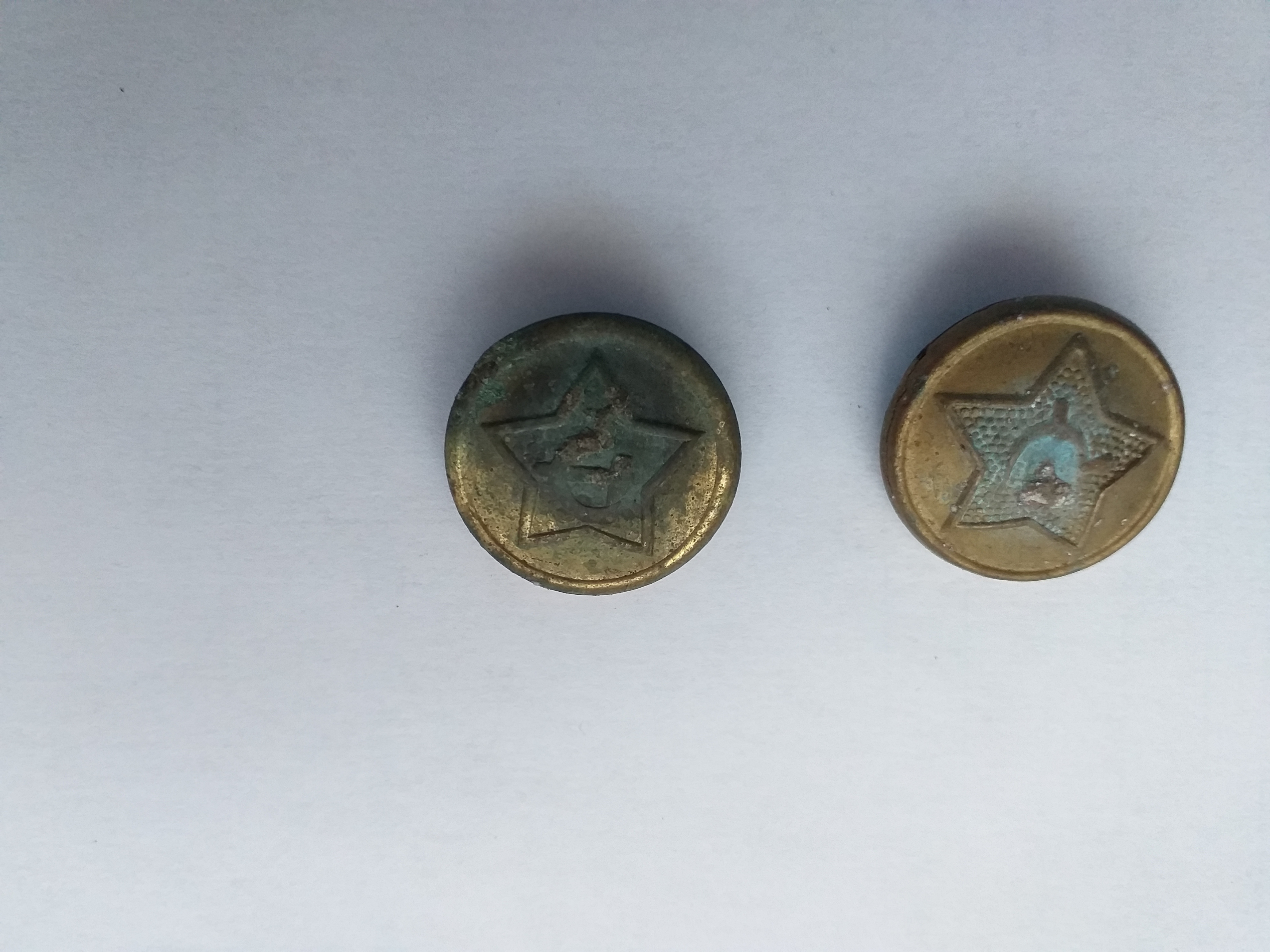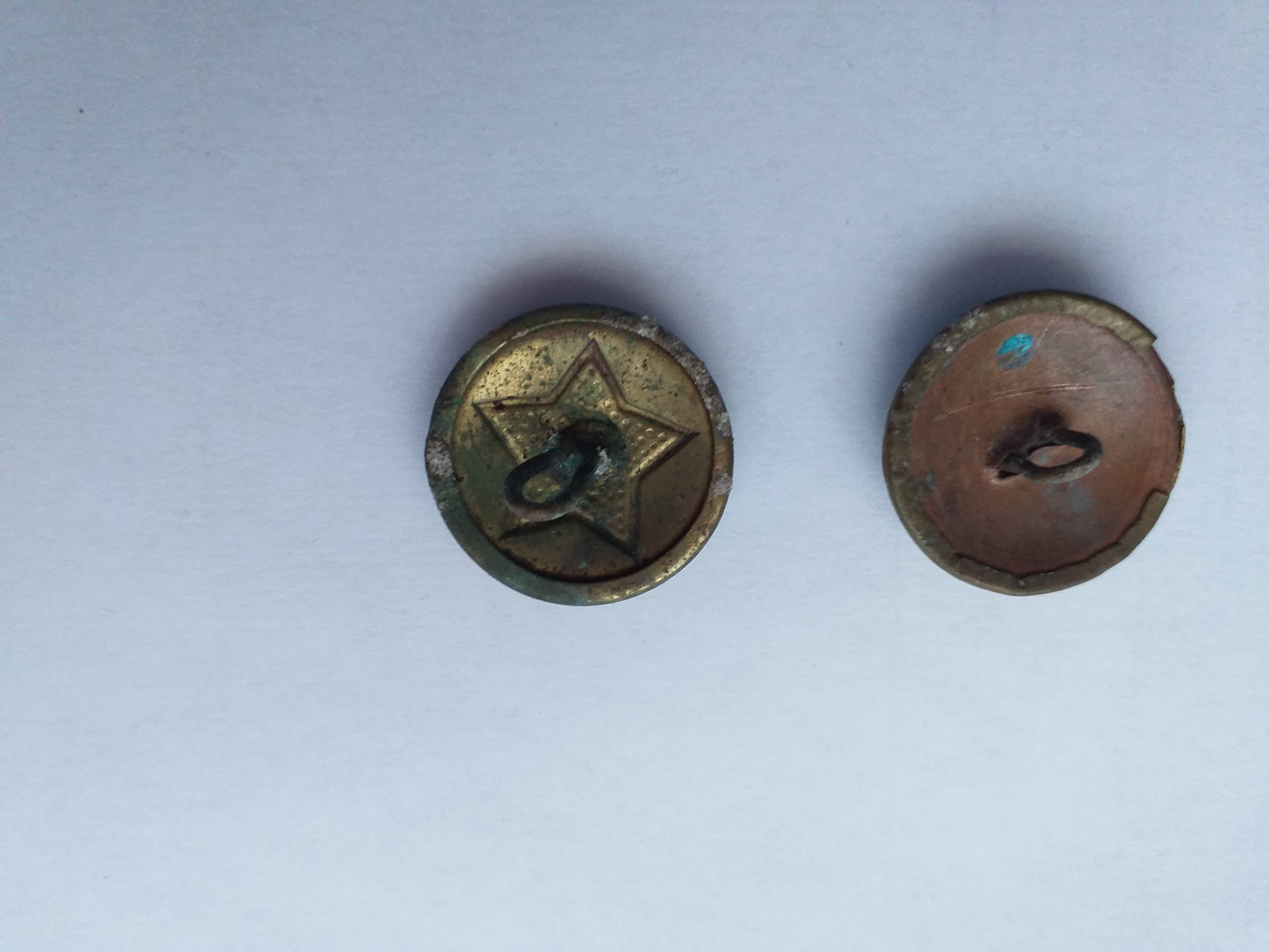Tulid kaks sellise tegumoega nööpi välja.Karujärve lähedalt Saaremaalt.Seal olid ju suured Vene sõjaväebaasid ja ju nööpe jagus ka külarahvale.Üks on vasknööp, millele viisnurgaga plönn peale pressitud.Teine aga ilma vasksüdamikuta.Et mis aegsed siis?