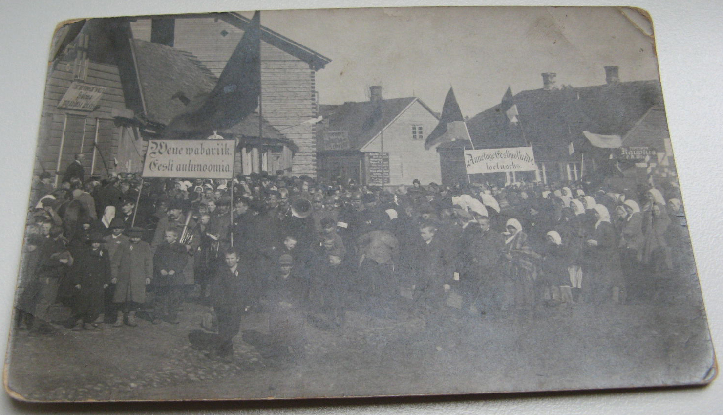 Foto 1. maist 1917. Miitingul kõneleb kooliõpilane Eduard Kotilõim ja kooliõpetaja Hans Hiiop (tekst tagaküljelt). Plakatitel tekstid: "Annetage Eesti polkude toetuseks" ja "Wene vabariik. Eesti autonoomia". Eduard Kotilõim oli Hugo Treffneri gümnaasiumi 1916. aasta vilistlane (https://www.htg.tartu.ee/d7/lennud_d.php?aasta=1916). Kas foto võib olla Tartus tehtud, tunneb keegi koha ära?