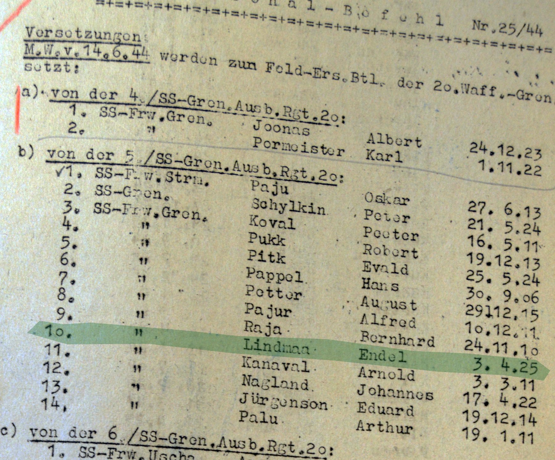 Vahepeal leidisn arhiivimaterjalidest, et 1944. aasta juuni keskel on Lindmaa tagavararügemendi 5. kompaniist saadetud 20. ED välitäienduspataljoni juurde.