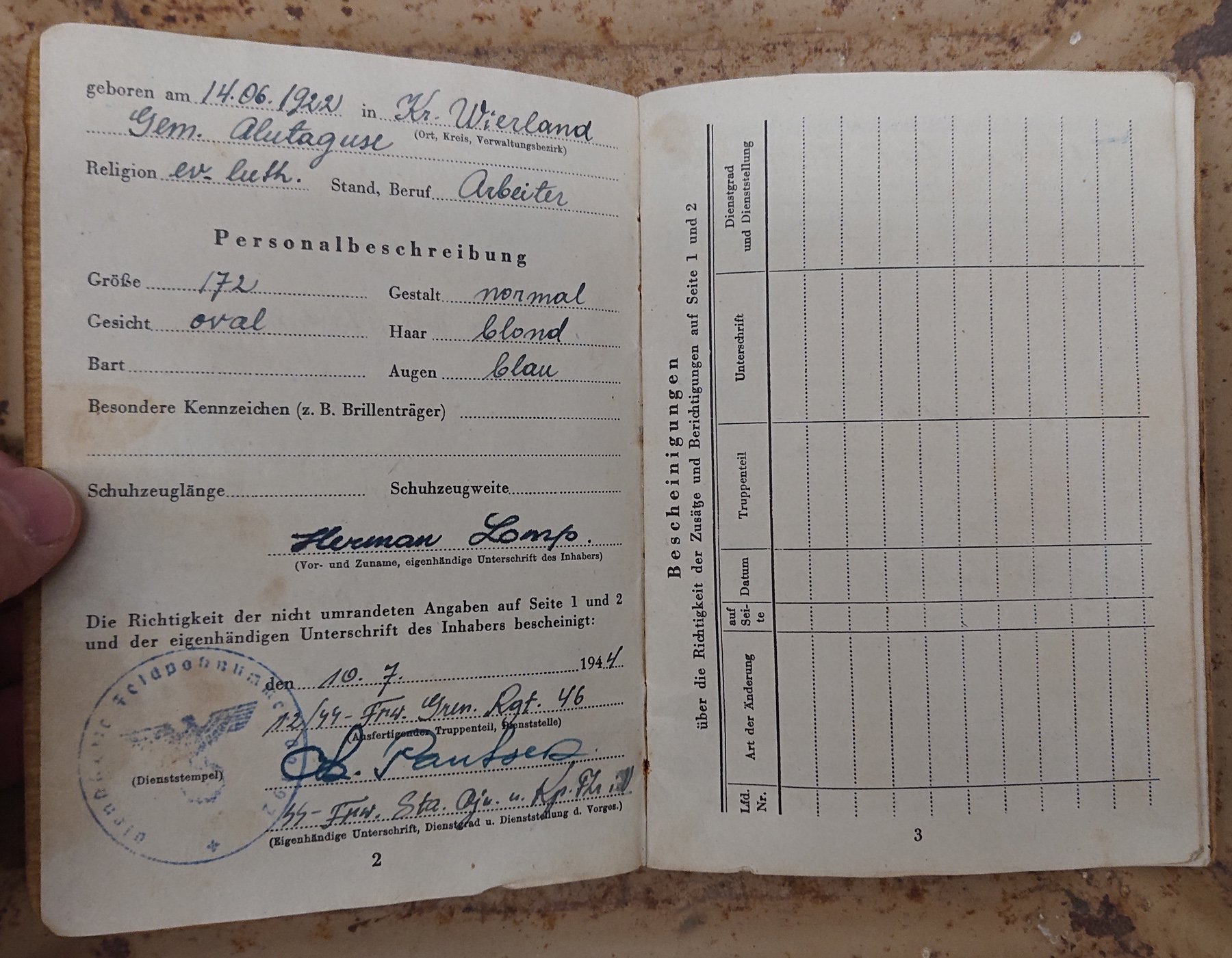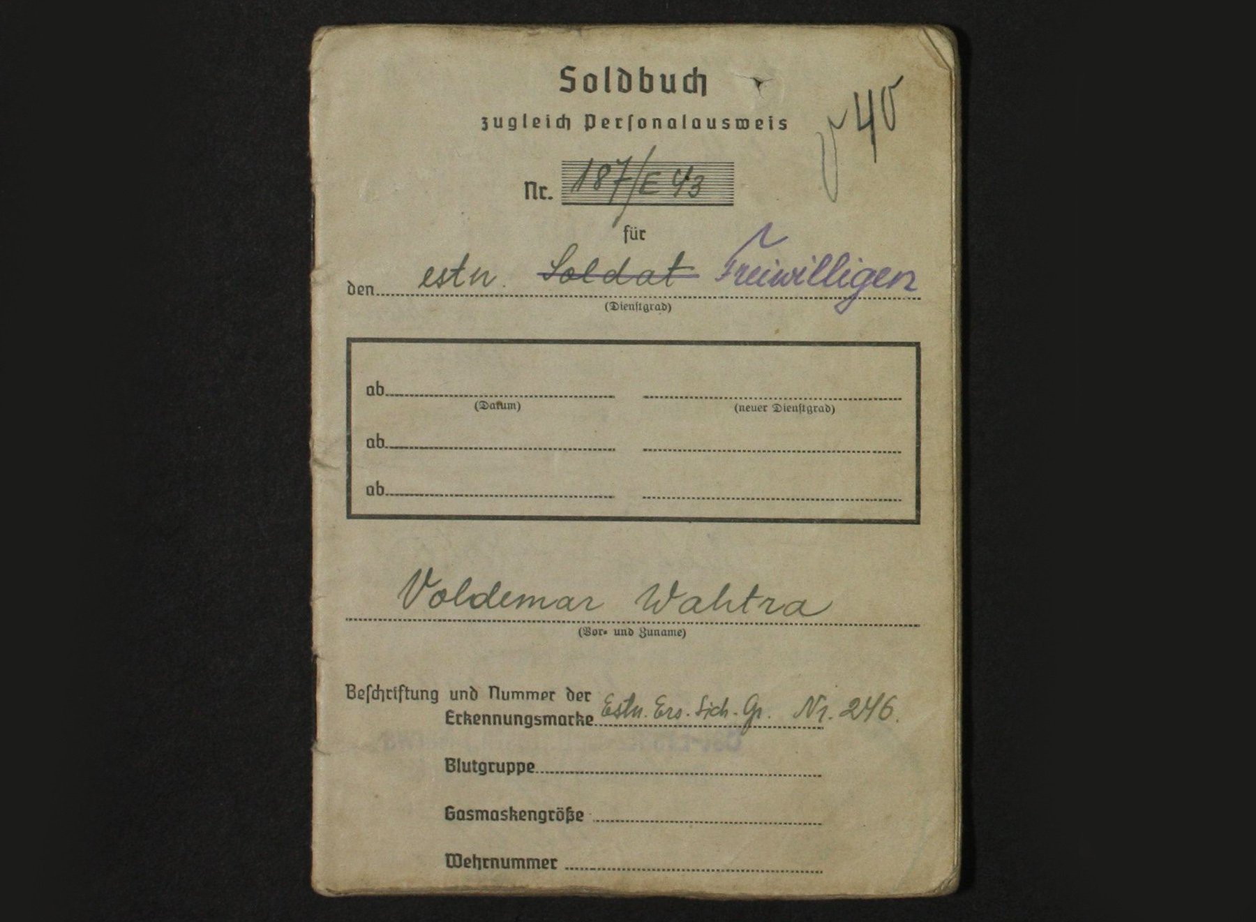 1943. aasta aprillis Eesti Leegionisse astunud Grenadier Eduard Paju Soldbuch.