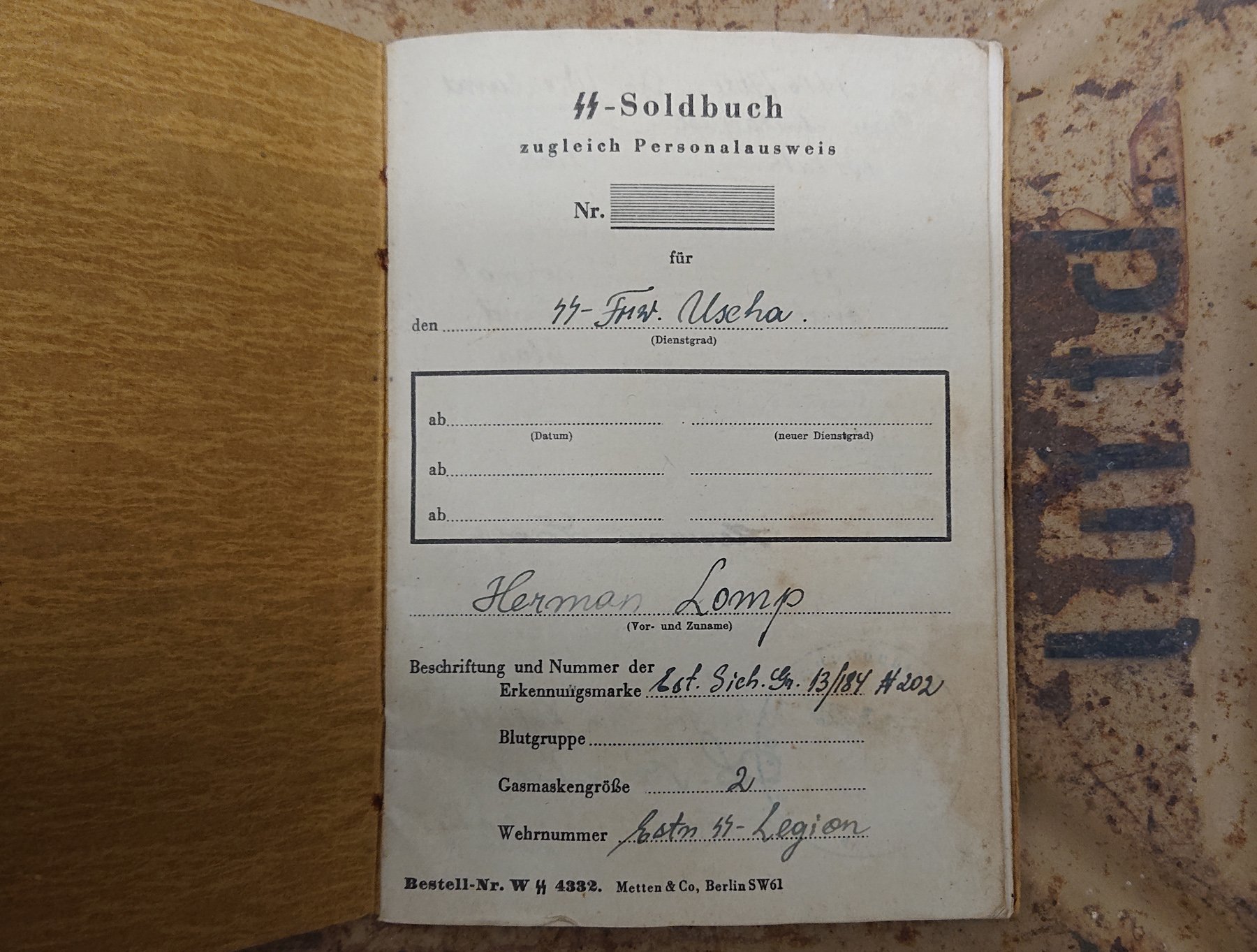 LW-Helfer / SS-Grenadier Henry Rüütel, säilinud on ainult palgaraamatu esikaane siseküljel olnud portreefoto.