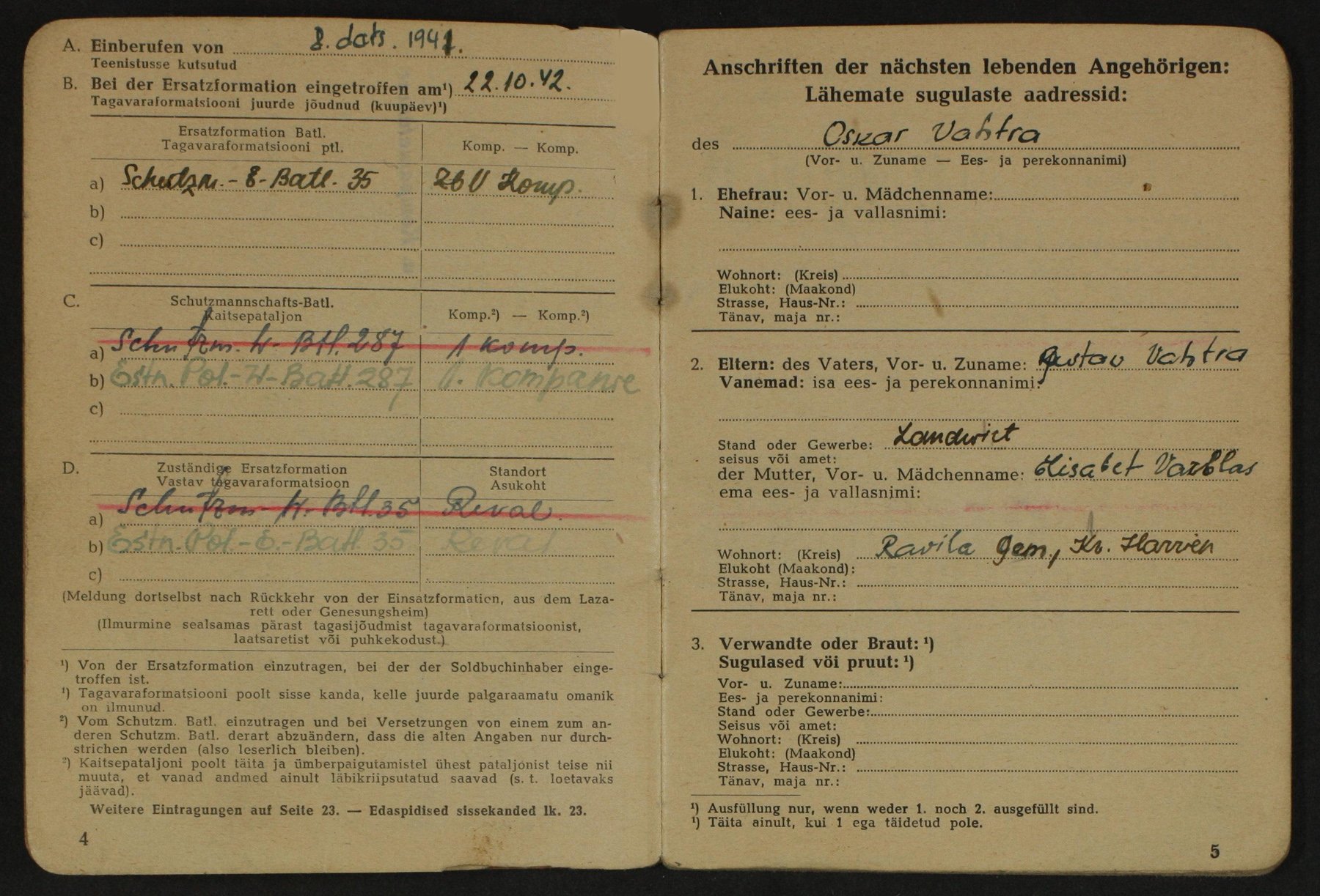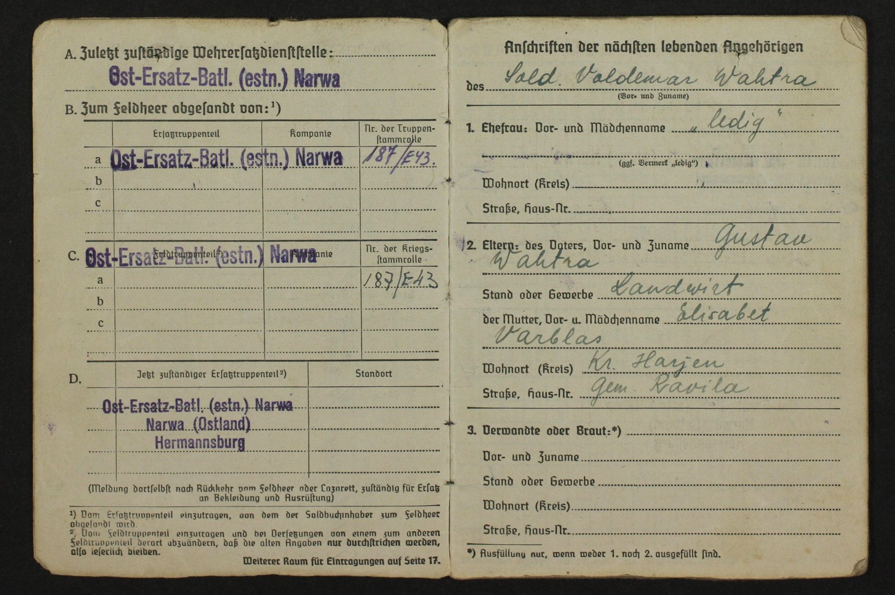 Endise "Erna" grupi võitleja, 2. klassi Raudristi kavaleri Voldemar Vahtra Soldbuch.