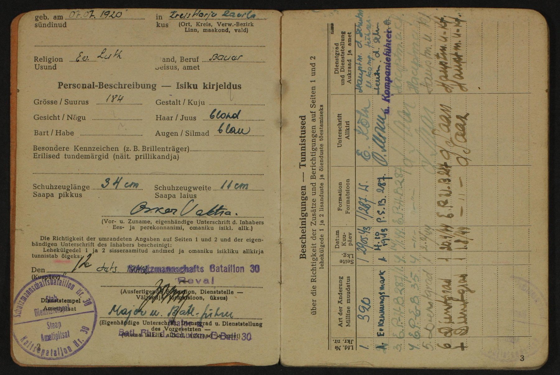 Selle teema 3. leheküljel näidatud Untersturmführer Evo Meere Soldbuch jõudis täna Eestisse. Lisan natuke suuremad pildid kui olid eelnevalt siia teemasse postitatud. Fotole löödud templilt loeks nagu välja "SS-Pz.Gren.Schule" - ilmselt siis Neweklau sõjakool aga praegu kiirelt vaadates tema nimi kusagilt kursuse nimekirjadest silma ei jäänud. Tema teenistuskäigust ei ole kahjuks eriti midagi teada aga kuna SB fotol on tema vormikuuel näha Dachau 1. variandi kraenurk ja on teada, et Neuhammeris jagati välja ja õmmeldi peale 2. variandi nurgad siis võiks nagu oletada, et ta oli sõjaväeteenistuses varem, enne selle palgaraamatu väljakirjutamist.