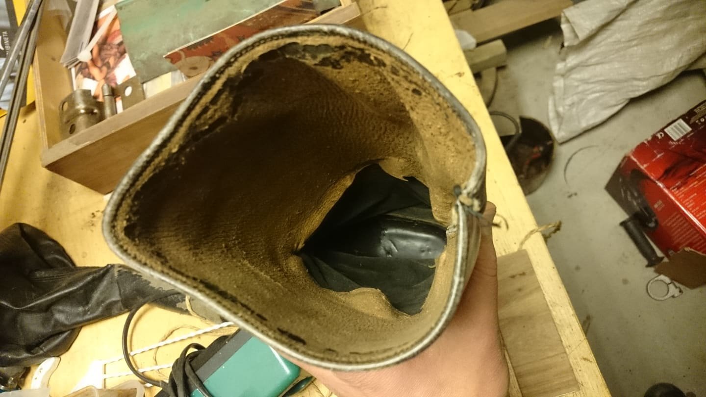 Jah, õige ta on, et säärest sisse peab ka vaatama. Lootus muidugi oli, et äkki ilmneb niisama ka midagi, aga eks potentsiaali näha, et targemad mehed asju kohe maha ei laitnud oli ka julgustav, et pildimasinaga edasi toimetada. Et jah, ei olnud esimese hooga pilte. Sõber nüüd maal käinud ja sai pildilisa. Ei ole päälesõjaaegsel jalavarjul sellist õmblust kunagi kohanud..Esimesed pildid siis nüüd saabastest, mis katuse vahelt tulid.