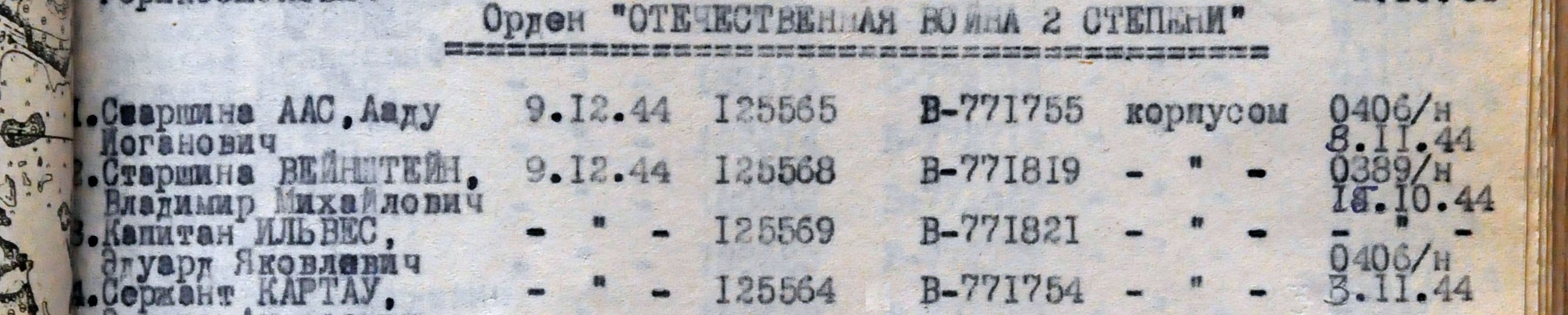 Lõpuks sai arhiivist ka infot. Autasude omanik on leitnant Ernst Kaasik, 249. Laskurdiviisi 197. üksiku sideroodu telefonirühma komandör. Punatähe ordeni nr. 843581 ja Isamaasõja II klassi ordeni nr. 284050 kavaler. Mõlemad autasud on saadud Eestimaa pinnal toimunud lahingute eest. Autasud ise on nähtaval selles teemas, leheküljel 14.tossom kirjutas: ↑K Nov 06, 2013 9:25 pm Eelmisel leheküljel on leitnant Nittimi Punatäht numbriga 846878. Suvel sattus mulle kätte kena komplekt ( küll ilma dokumendita ) mis legendi järgi samuti korpusepoisile kuulunud ja mul ei ole põhjust selles kahelda. Kahjuks aga pole aega olnud tegeleda autasulehtede tellimisega. Ilus komplekt, Punatäht nr. 843 581, Isamaasõja orden II klass nr. 284 050. Ordenite seisukord on nagu korpuse autasude puhul tavaks- eeskujulik.
