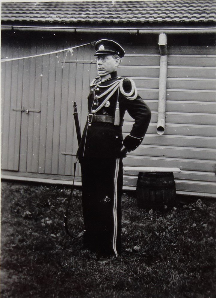 Tukiga tuletõrjuja 38 aasta vormis. Õlapaelad näitavad, et tegu on ka orkestris mängiva tuletõrjujaga.