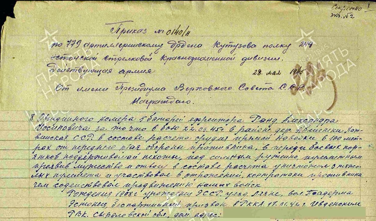249. laskurdiviisi 779. suurtükiväepolgu 5 patarei relvur? jefreitor Aleksander Rand. Lahinguteenete medali 2499777 kavaler. Kuramaa lahingutes Kblieniki? Küla juures 22.03.1945.a hävitas suurtükimeeskonna koosseisus 100 meetri kaugusel kaitseliinist vastase käsitulirelvade turmtule all otsesihtimisega kolm raskekuulipildujat ja lõid tagasi vaenlase vastupealetungi. Millega toetas oma jalaväge ja võimaldas vägedel edasi liikuda.