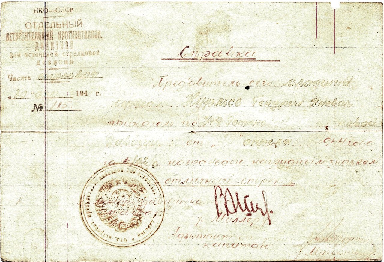 249. laskurdiviisi üksiku tankihävitusdivisjoni nooremseersant Hendrih Nurmse. Autasustati 1944. a aprillis rinnamärgiga ''Eeskujulik Laskur''. Nurmse sai Saaremaa lahingute eest ka Kuulsuse III klassi ordeni, mille number ei ole teada.