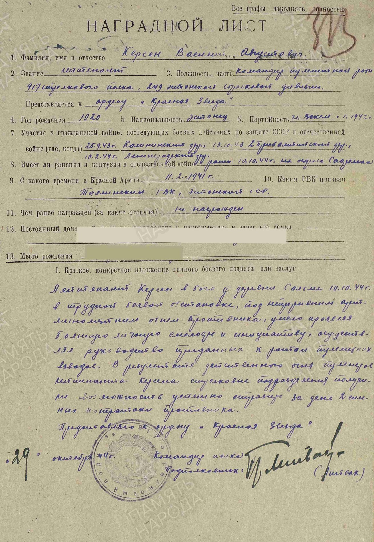 Punatähe orden (939309) annetatud 1944. aasta 10. oktoobril Saaremaal Salme küla juures toimunud lahingu eest, kus leitnant Kersen pideva suurtüki- ja miinipildujatule all juhtis osavalt kuulipildujate tuld ning mille tulemusena õnnestus päeva jooksul tõrjuda kaks sakslaste vasturünnakut. Lahinguliste teenete eest medal (1288169) antud 17.09-26.09.1944 perioodi eest.