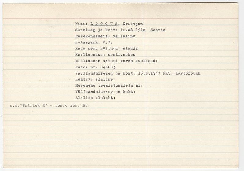 Keywords: unmarried, beginner seaman, speaks german and estonian Checked postwar Estonian newspapers abroad, only mention of him was from 1972, when he visited Toronto