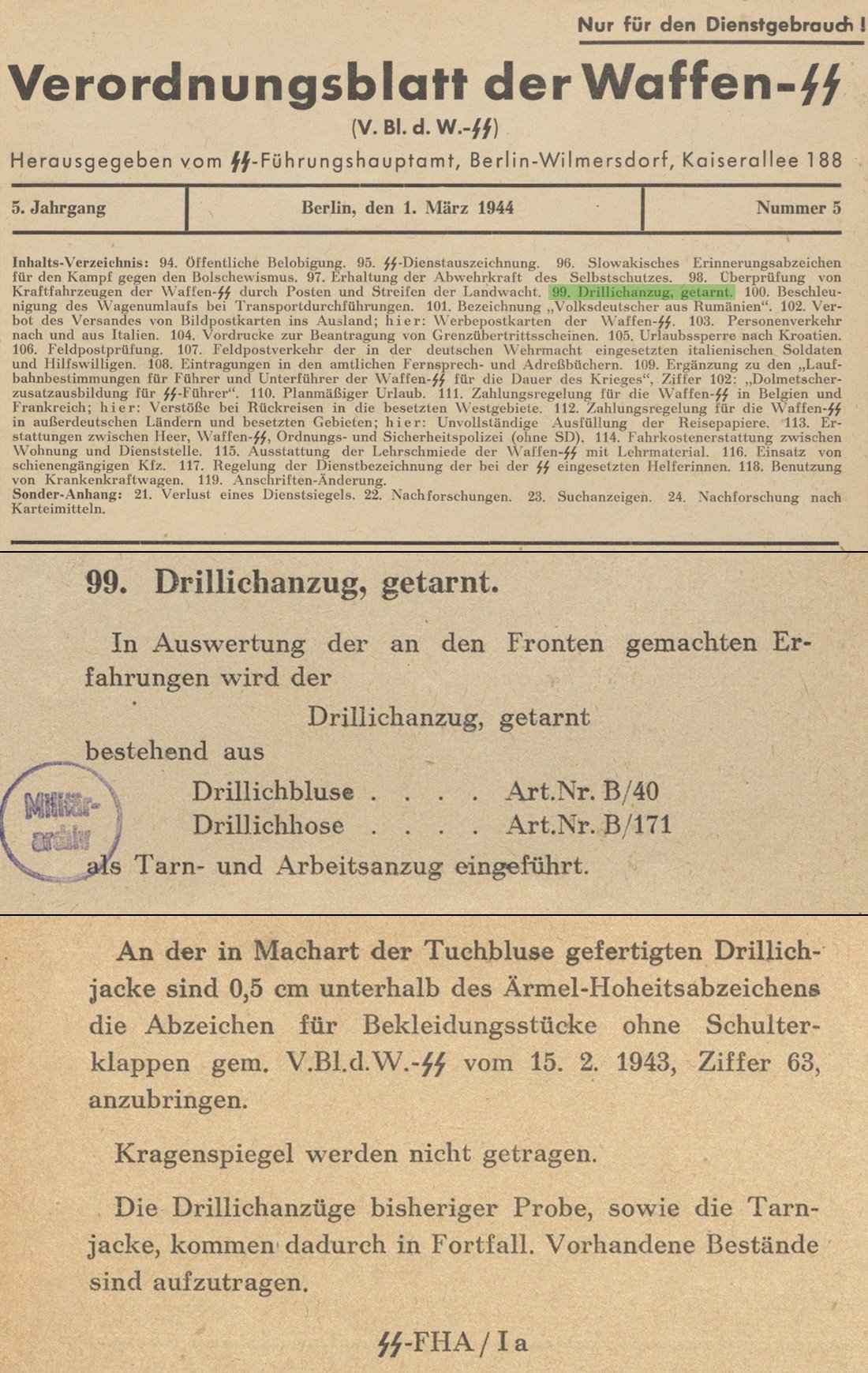 1944. aasta 1. märtsis ilmunud päevakäsus öeldakse: Hinnates rindelt saadud kogemusi tutvustatakse maskeerimisülikonda (jakk - Art.Nr.B/40 ja püksid - Art.Nr.B/171) kui maskeermis- ja tööriietust. Kuuel tohib kanda embleemidest ainult kotkast ja selle all auastmetunnuseid, mis on mõeldud õlakuteta / maskeerimisriietusele. Varasemad katsetamiseks / näidisteks antud maskeerimisülikonnad ja maskeerimisjakid kantakse lõpuni.