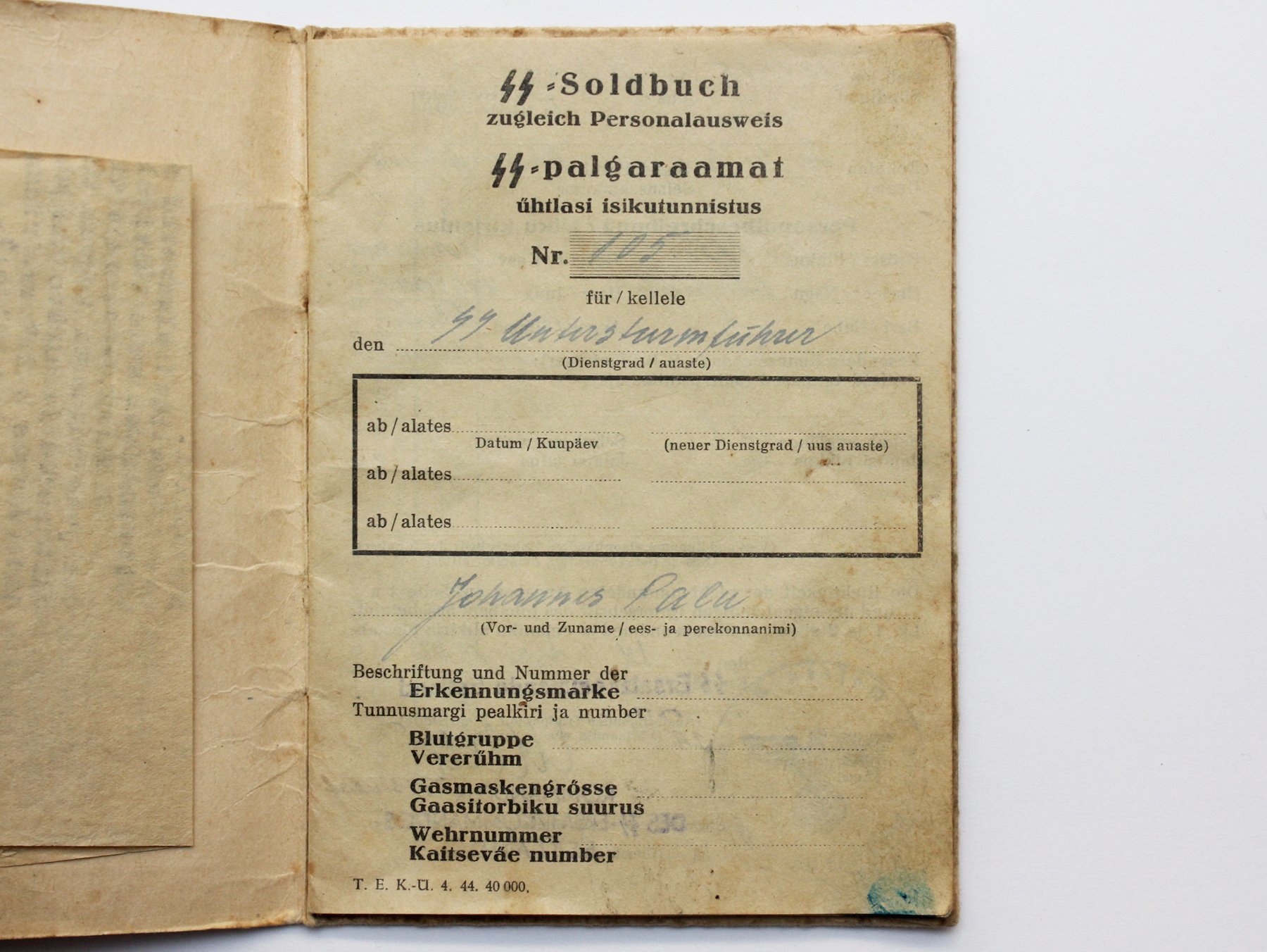SS-Untersturmführer Johannes Palu palgaraamat (L. Tammiksaare kollektsioon).