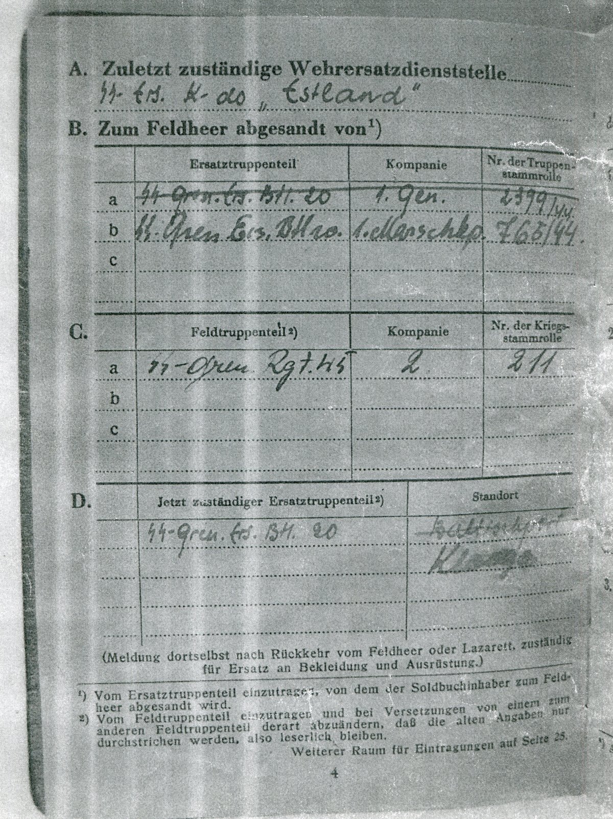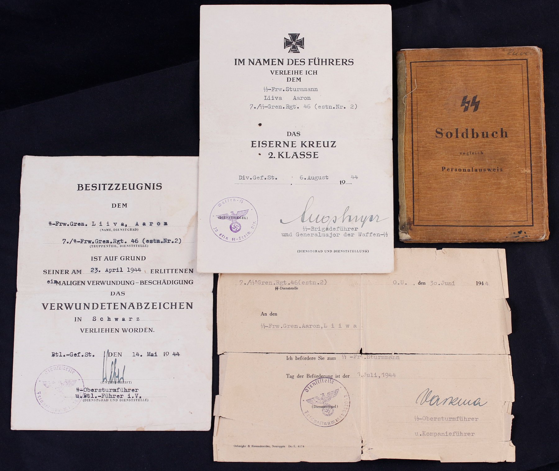 UnterKroon kirjutas:SS-Frw.Grenadier Verner Loos´ile kuulunud Soldbuch. Vähestest märgetest huvitavaim on sissekanne granaadi(mürsu) killust haavata saamise kohta.
