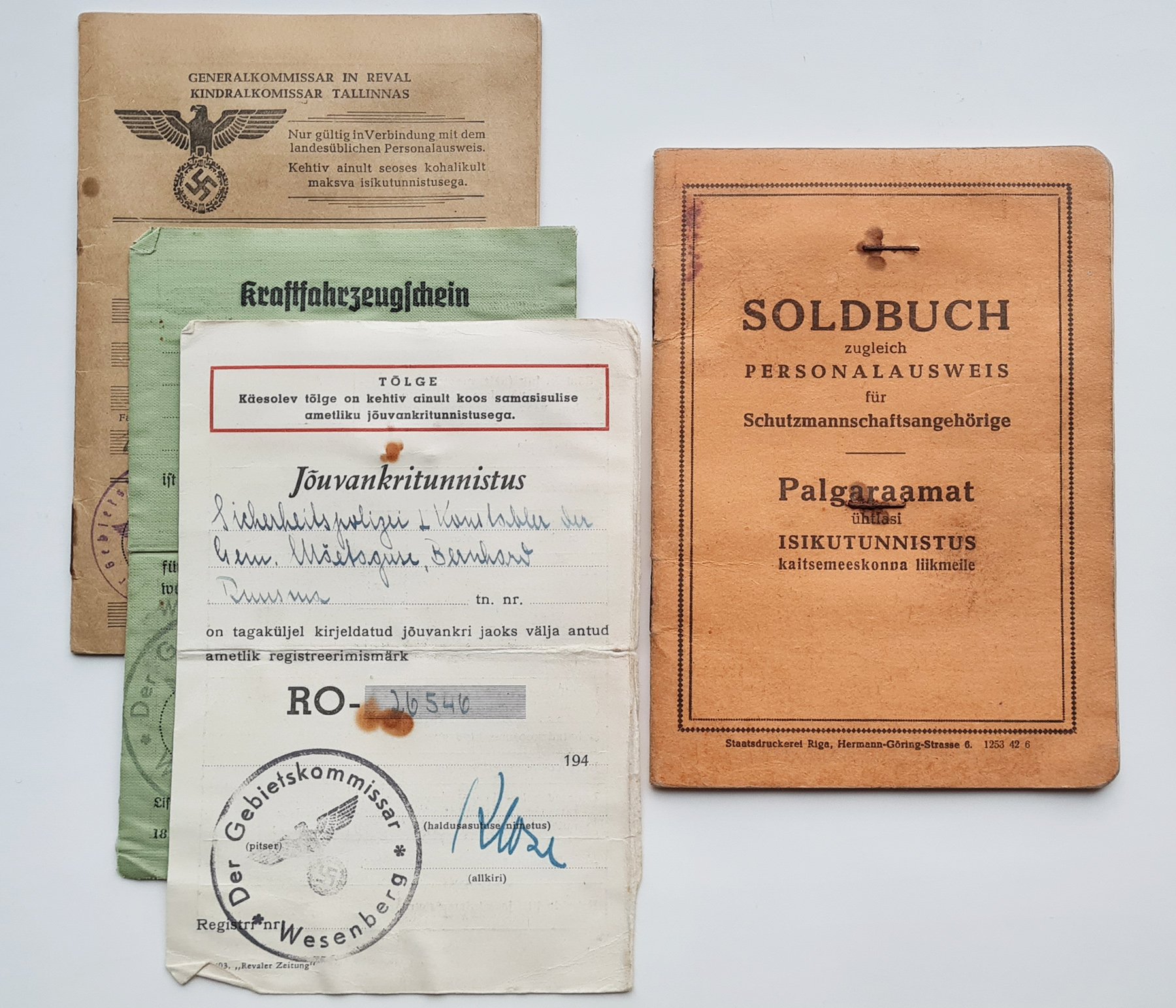 Eile tuli Soomest selline Eesti mehe dokumentide komplekt - palgaraamat, tööraamat ja sõjaaegsed mootorratta juhiload. Palgaraamat oma sissekannete poolest on igav aga isik ise on üsna huvitav. Bernhard Ruusma (Bernhard-Johannes Russman) teenis sõja ajal välja antud tööraamatu järele Piirivalves, 1933-1935 aastatel oli Kaitseliidu liige ja enne sõja algust oli Mäetaguse vallas konstaabel. Sõja puhkedes, 1941. aasta juunis sai käsu ilmuda Punaarmee mobilisatsioonipunkti aga hoidis sellest kõrvale ja varjas ennast koos teiste metsavendadega Puru küla lähedal metsas. Kui sakslased kohale jõudsid siis astus 1941. aasta augustis vabatahtlikult Saksa politseisse ja oli ametis Mäetaguse konstaablina kuni 1944. aasta septembrini. Tema juhilubadele on tema ametinimetus Sicherheitspolizei Konstabler (Julgeolekupolitsei konstaabel). Palgaraamat oma sissekannete poolelt on hõre - on saanud Saksa riigi poolt kampsuni, paar paari sokke ja nipet-näpet veel. 1942. aasta kevadel on talle välja antud Vene poolautomaat, mille ta on tagasi andnud 1944. aasta aprillis. Tagasi andis ilmselt seetõttu, et paar nädalat varem, 27. märtsil 1944 anti talle püstolkuulipilduja MP40.