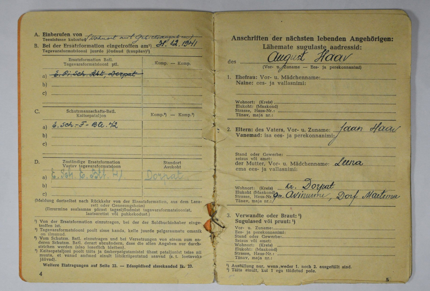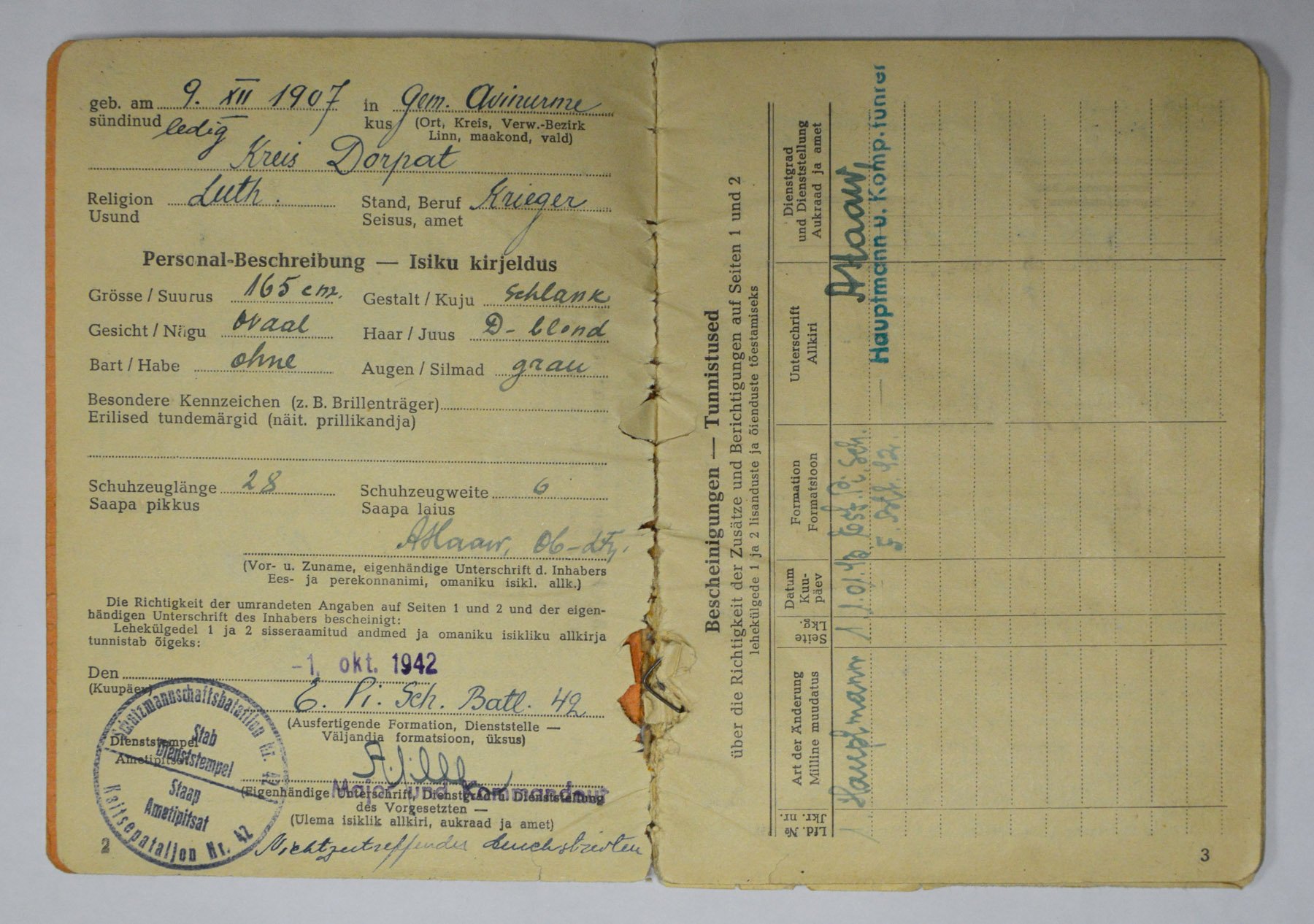 42. Eesti Politseipataljoni kompaniiülema Hauptmann August Haav'a Soldbuch.