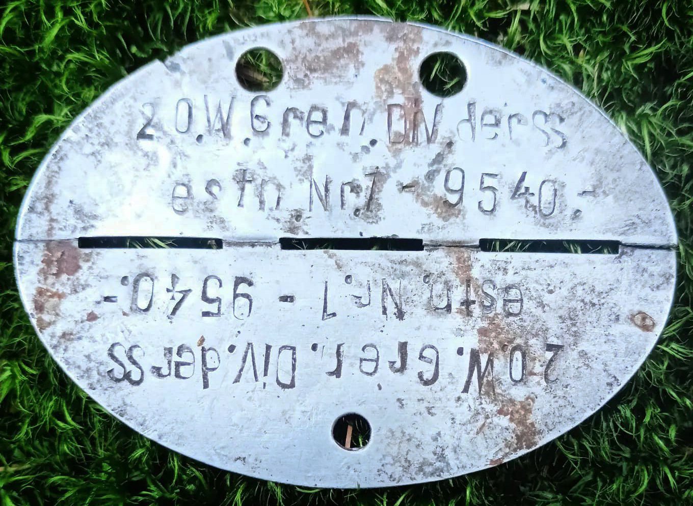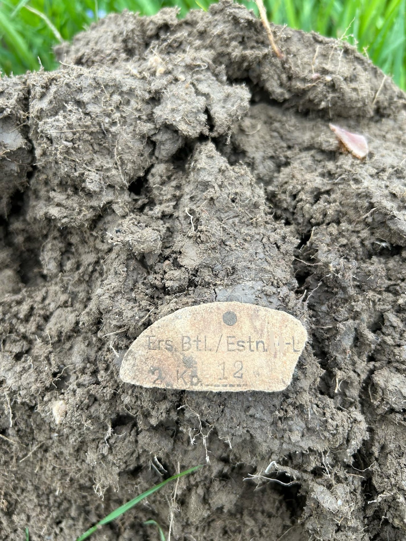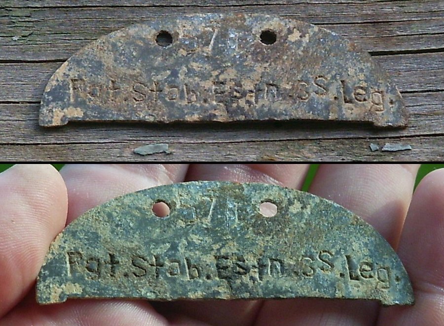 Tulen korra veel tagasi teema esimesel lehel näidatud Rgt.Stab.Estn.SS.Leg. kirjaga variandi juurde ja lisan pildi 2004. aastal Jõhvi VS mälestussamba juurest välja kaevatud poolikust žetoonist. Isikunumber on 57 F ja see tähendab, et kindlasti on tegemist ohvitserile kuulunud Erkennungsmarkega. Siin teemas mitmeid kordi viidatud kaotuste nimekirjadest kahjuks sellise numbriga žetooni omanik välja ei tule.