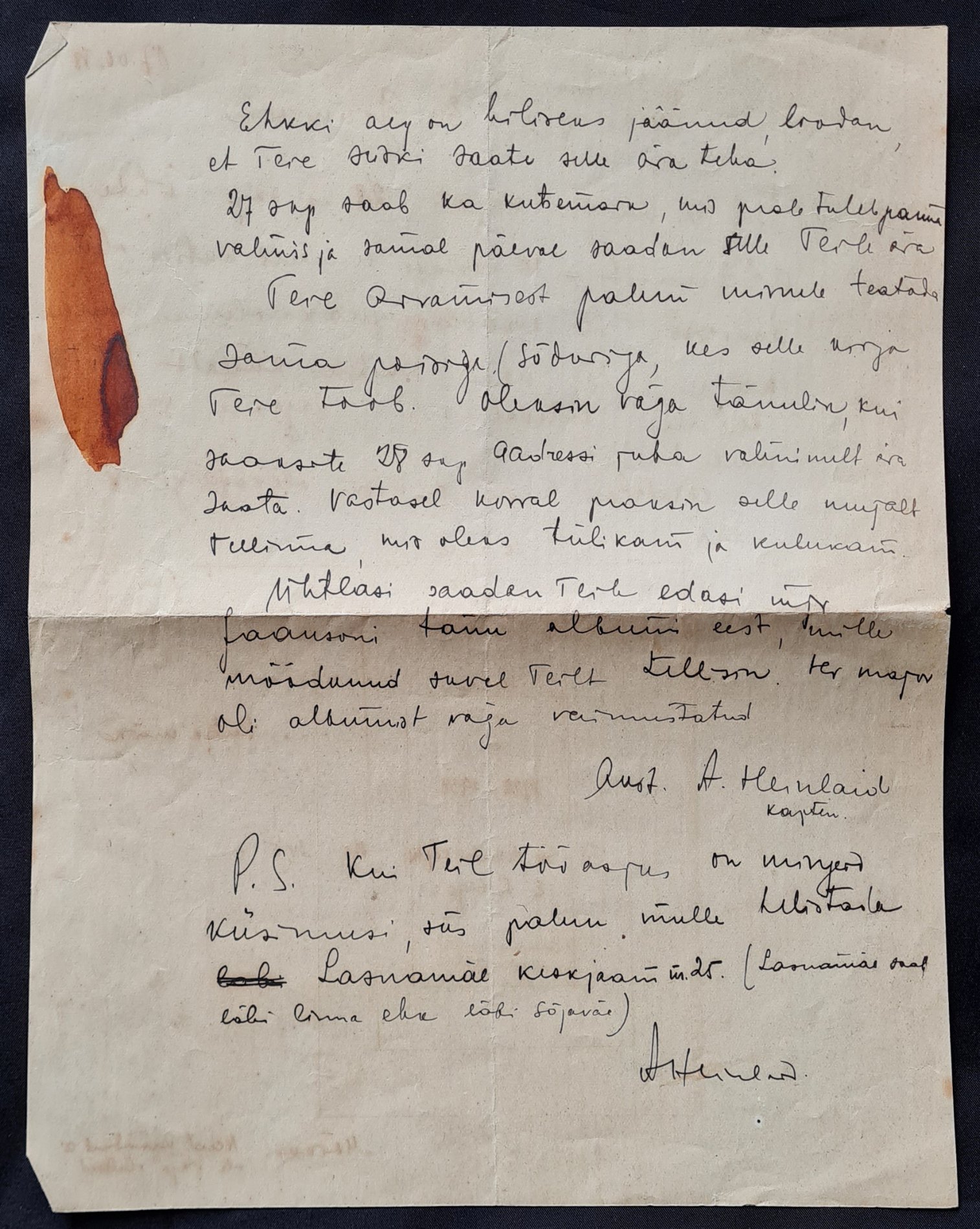 P.S. Kui Teil tööasjus on mingeid küsimusi, siis palun mulle helistada Lasnamäe keskjaam nr. 25 (Lasnamäe saab läbi linna ehk läbi sõjaväe).
