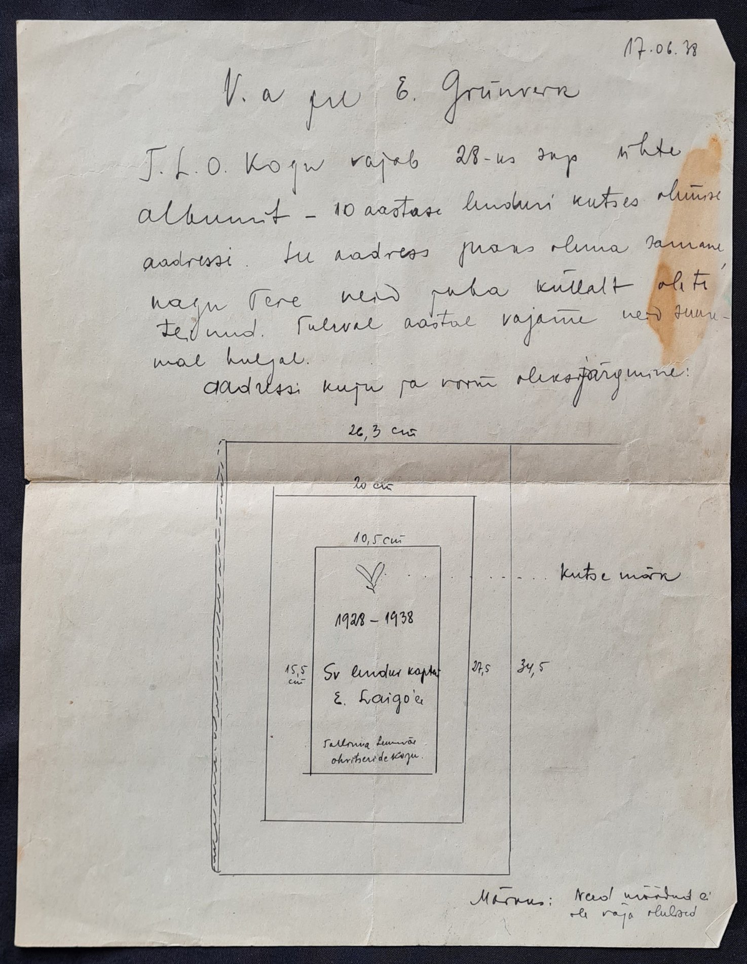 27 skp saab ka kutsemärk, mis peale tuleb panna valmis ja samal päeval saadan selle Teile ära. Teie arvamisest palun minule teatada sama poisiga (sõduriga, kes selle kirja Teile toob). Oleksin väga tänulik, kui saaksite 28 skp aadressi juba valminult ära saata. Vastasel korral peaksin selle mujalt tellima, mis oleks tülikam ja kulukam.