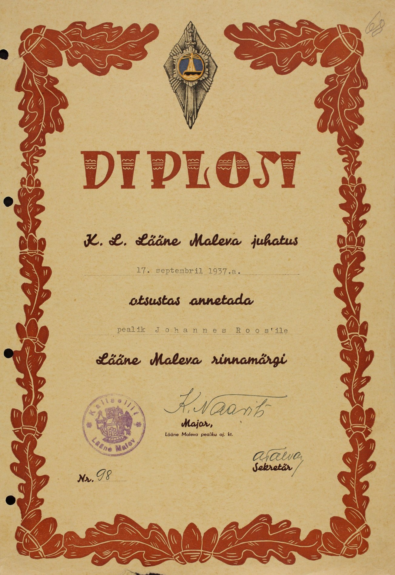 Kaitseliidu Lääne Maleva juhatuse otsusega 17.09.37 annetati maleva 20. aastapäevaks rinnamärgid järgmistele Hiiumaa malevkonna Pühalepa üksikrühma liikmele: Konstantin Ingre (Ingland), Gustav Vaarik ja Johannes Roos. Joh. Roosi diplomi originaal asub Riikliku Julgeoleku Sõjatribunali toimikus kui kuriteo asitõend. ERAF 129SM1 3785uscha kirjutas: ↑R Nov 14, 2014 3:26 pm Kuna teema esimesest postitusest on Lääne maleva rinnamärgi pilt kaduma läinud siis lisan selle uuesti.