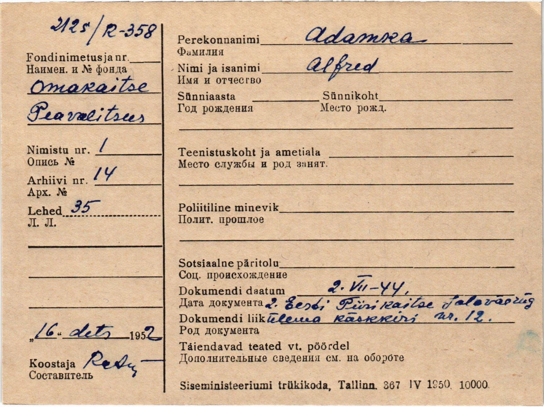 Kirjutab niimoodi: Alfred Adamka 2. Piirikaitserügement 7.kompanii, ülema kohusetäitja(alates 17.4.1944) . Auastemeks on tal siis Leitnant nagu arvatud.