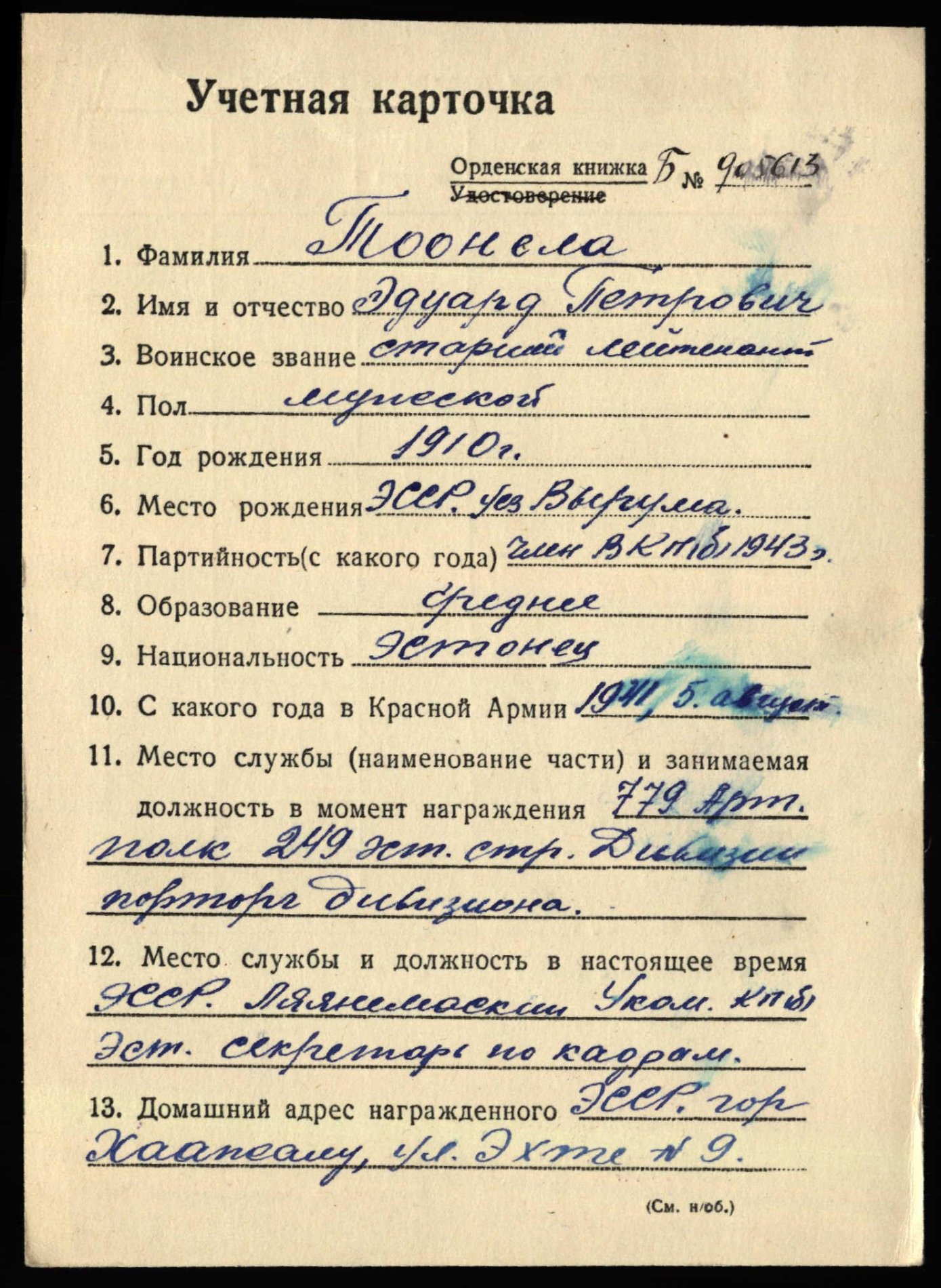 Vanemleitnant Eduard Toonela, 249. Laskurdiviisi 779. Suurtükiväepolgu 1. divisjoni partorg. Punatähe ordeni 1480717 kavaler.