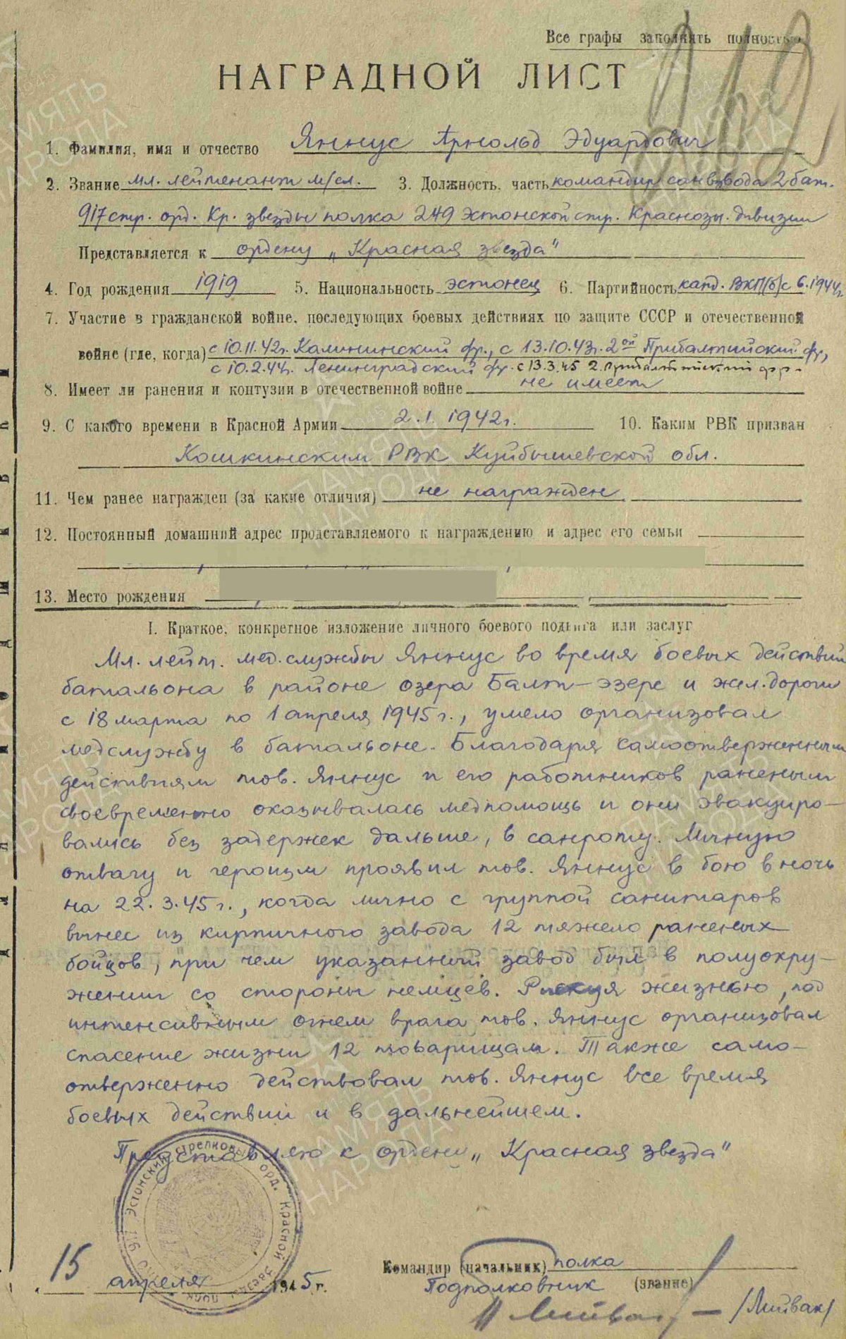 Sõrve poolsaare lahingutes 12.10.1944 läbi murdes vastase poolt tugevalt kindlustatud positsioonidest Ungru-Pagila joonel määratles divisjoni parteiorganisatsiooni juhtides õigesti oma koha lahingus mille käigus oli parteiorganisatsioon lahinguülesannete täitmisel suureks abiks.... jne.