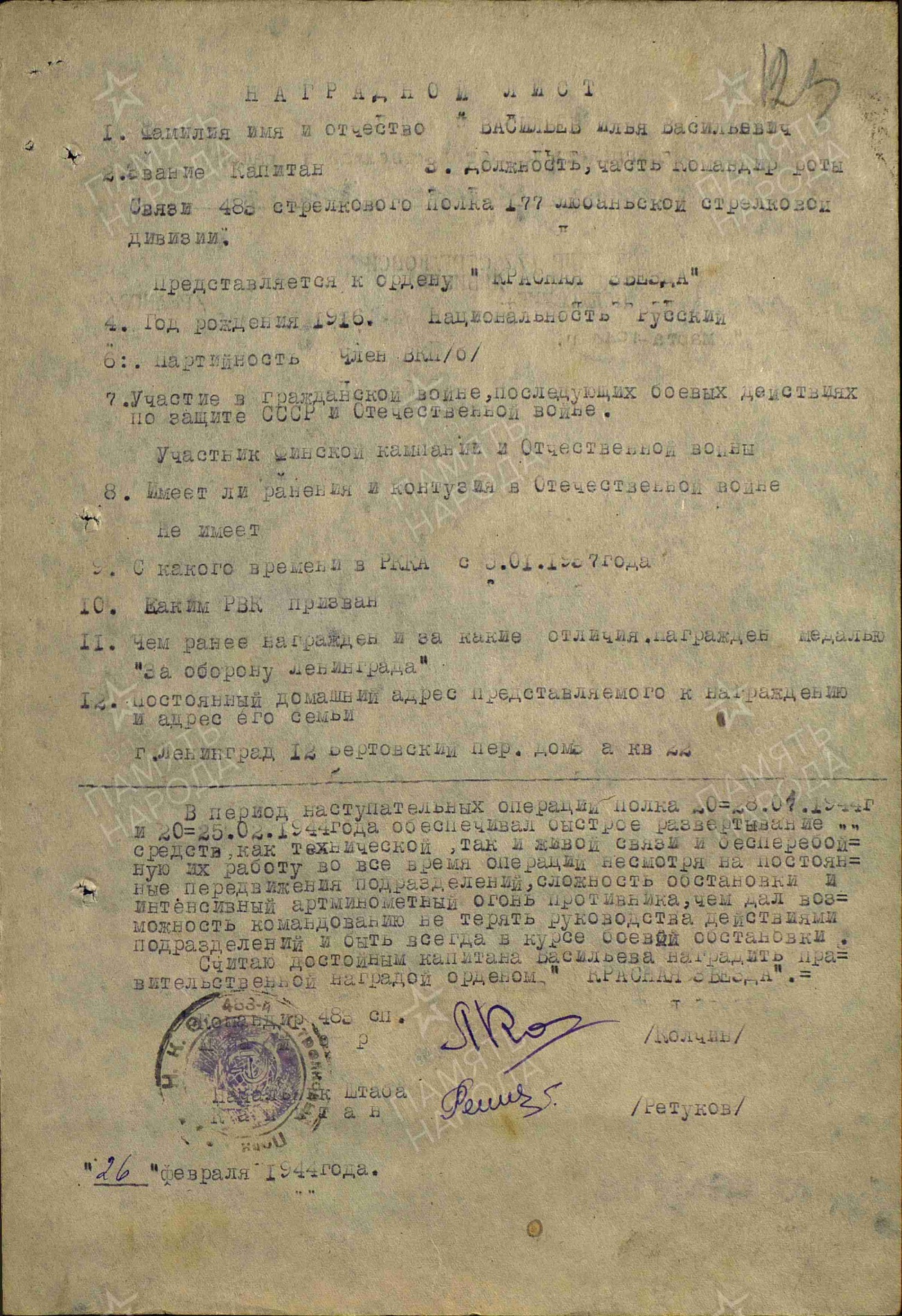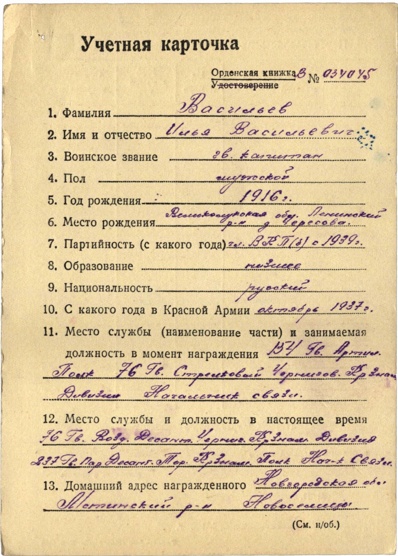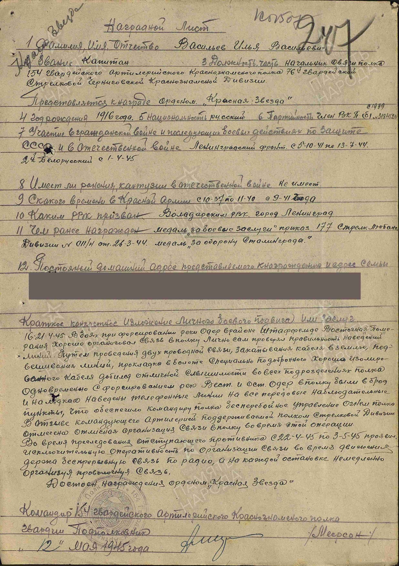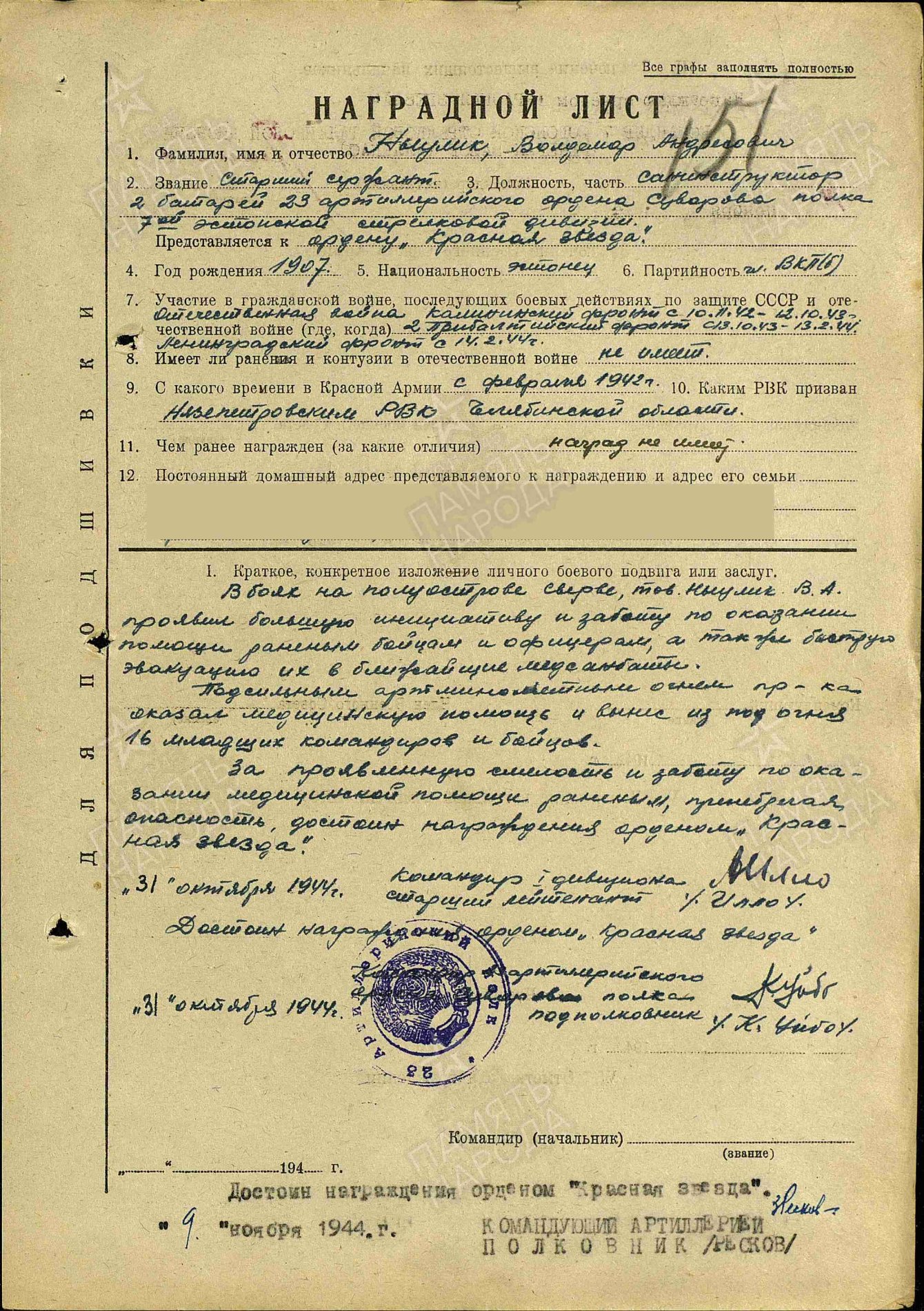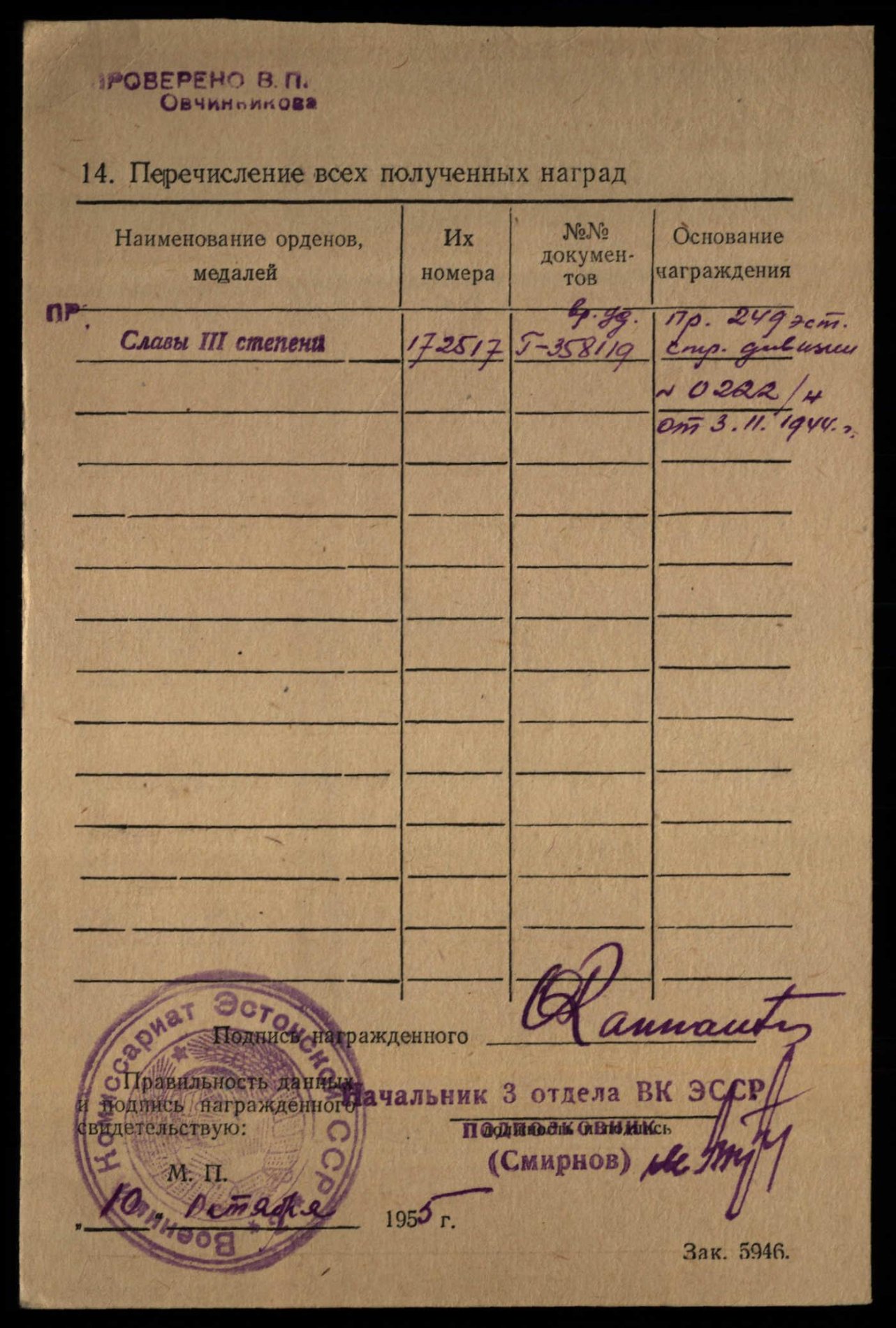 See lahinguteenete medal pole antud Korpusele või Eestlasele, kuid see on seotud 1944 Veebruaris toimunud lahingutega Narva rindel. Kavaler on saanud ka punatähe, ilmselt Kuramaa lahingute eest kuid ma ei leidnud autasulehte pamyatis kuna tema nimelisi on seal 500 lehekülge. Kui keegi loeb sünnikoha välja oleks abi…