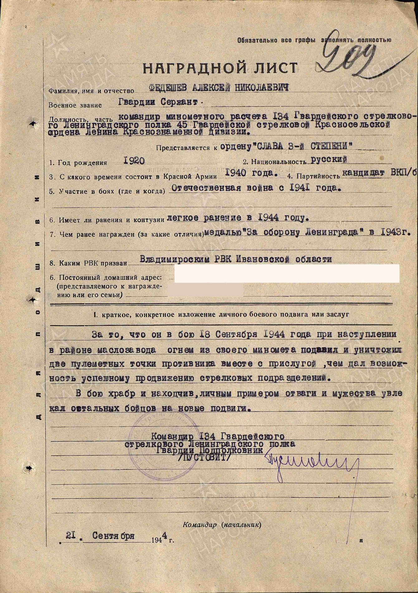 Autasulehel kirjutab, et 18.09.1944 hävitas ta võitehase juures kaks vaenlase kuulipildujapunkti, millega andis üksustele võimaluse edasi liikuda.