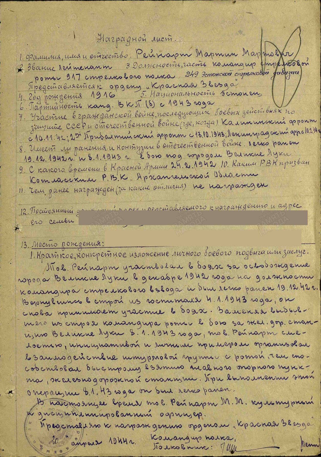 See orden on siin juba varasemalt olemas, aga nüüd on ka tausta kohta midagi teada. Niisiis- vanemleitnant Martin Reinart, autasustamise hetkel 249. Laskurdiviisi 917. laskurpolgu pataljonikomandöri abi, Isamaasõja ordeni II klassi ordeni nr. 450523 kavaler. Reinart on 1944.a saanud ka Punatähe ordeni, selle numbriks on 516437 ja antud Velikije Luki lahingutes osalemise ja haavatasaamise eest.