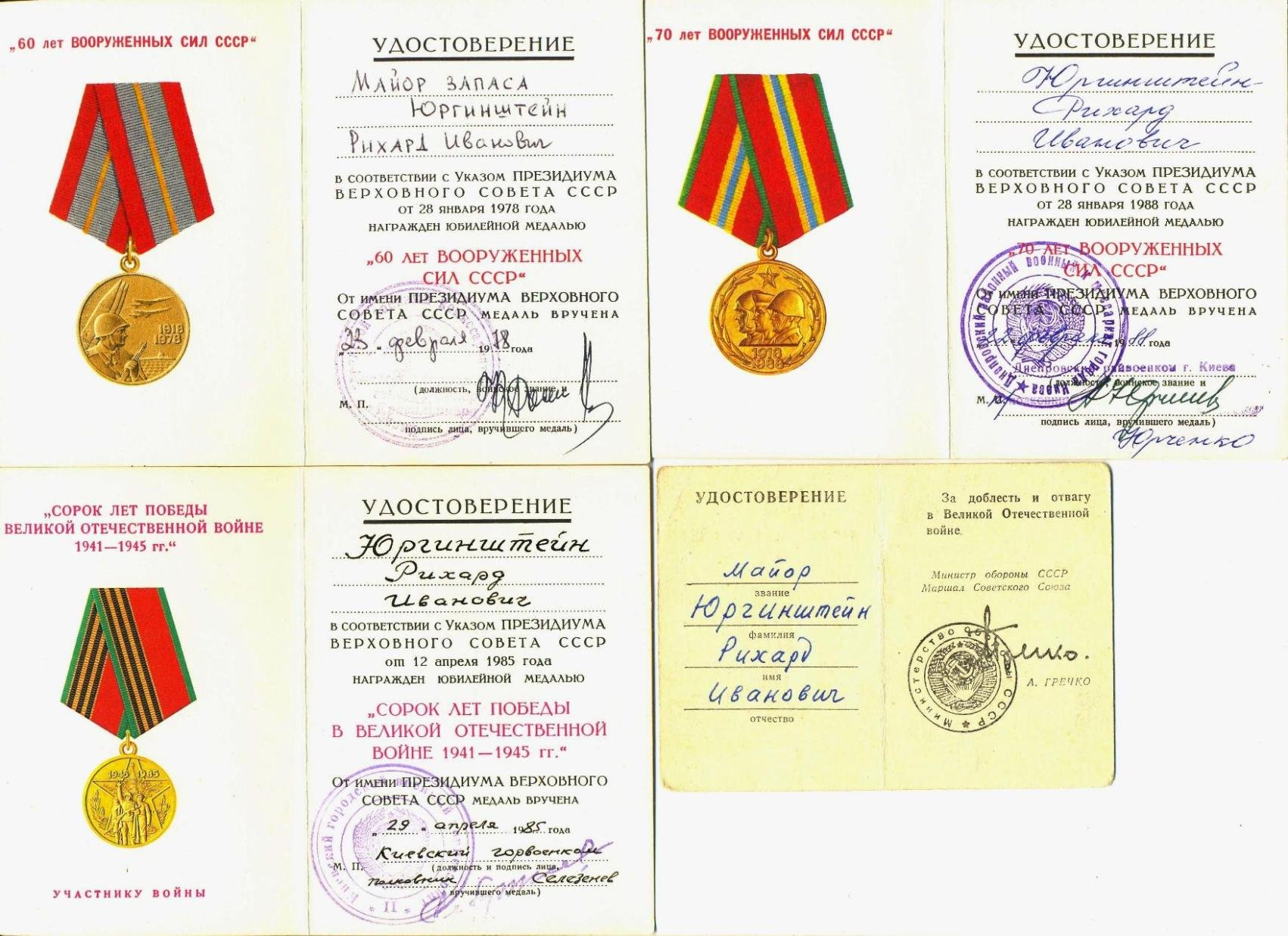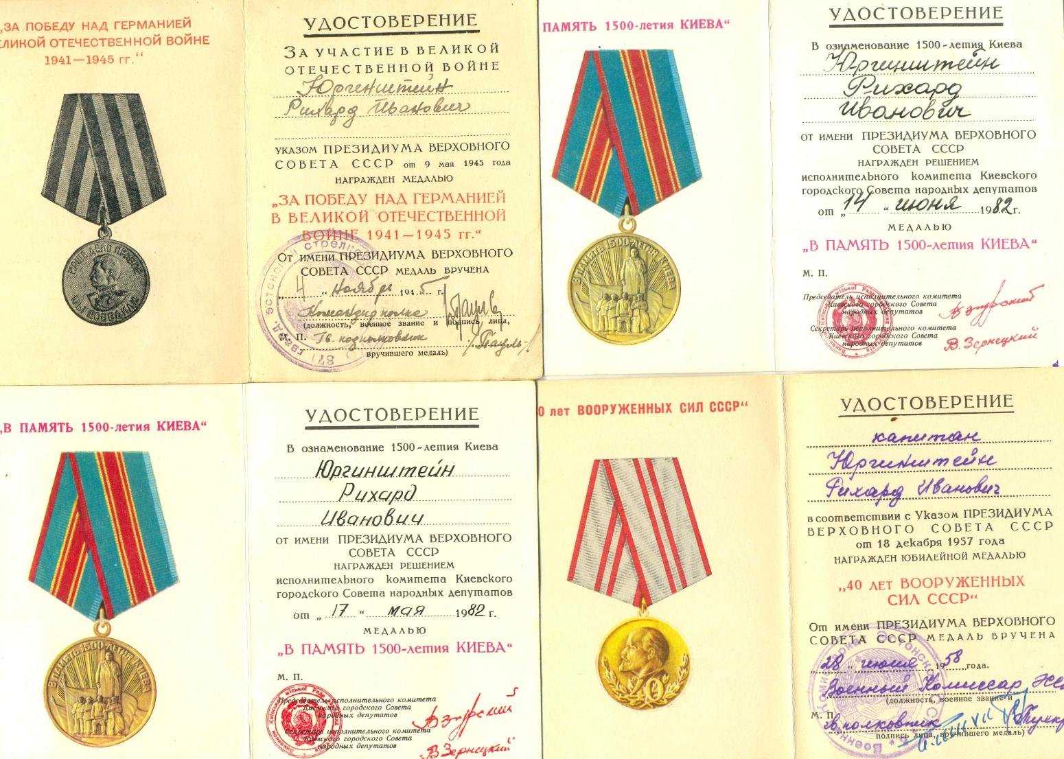 Kuskilt foorumist üles korjatud sõja ajal leitnant Rihard Jürgensteini autasude dokumendid. Venemaa eestlane, 1922. aastal sündinud mees. Medali ''Võidumedal Saksamaa üle'' dokumendis 371. Kaardiväe Eesti Laskurpolgu tempel ja kaardiväe alampolkovniku Ilmar Pauli allkiri. Jürgenstein teenis Nõukogude armees ka pärast sõda, teda autasustati 1956. aastal Punatähe ordeniga nr. 3441867 ja varem, aastal 1954. on ta saanud Lahinguteenete medali. Ilmselt millaski seitsmekümnendate teises pooles on siis juba majori auastmes mees liikunud Eestist Ukrainasse. Huvitav on see, et teda on kaks korda autasustatud medaliga ''1500 aastat Kiievit'', ilmselt on kuskil lihtsalt midagi segamini läinud.