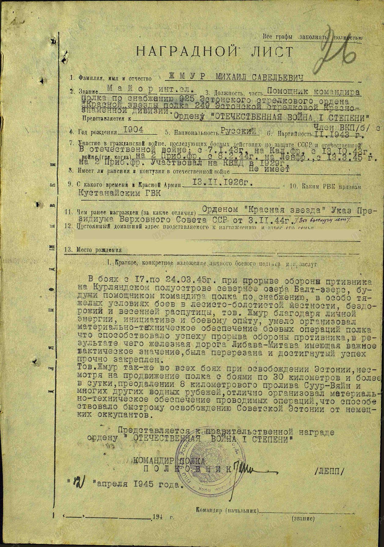 Major Mihail Zmur, 249. Eesti Laskurdiviisi 925. laskurpolgu komandöri abi varustusalal. Punatähe ordeni 1309156 kavaler. See orden (nagu ka autasulehel näha olevad Punalipu orden nr. 310781 ja Lenini orden nr. 203742) on antud talle Punaarmees väljateenitud aastate eest. Zmur on ka Isamaasõja II klassi ordeni nr. 427270 kavaler ja selle sai ta 1945. a märtsis Kuramaal, kus organiseeris väga rasketes tingimustes polgule materiaal- tehnilist tuge ning osaliselt ka lahingute eest mis toimusid varasemalt Eestimaa pinnal.