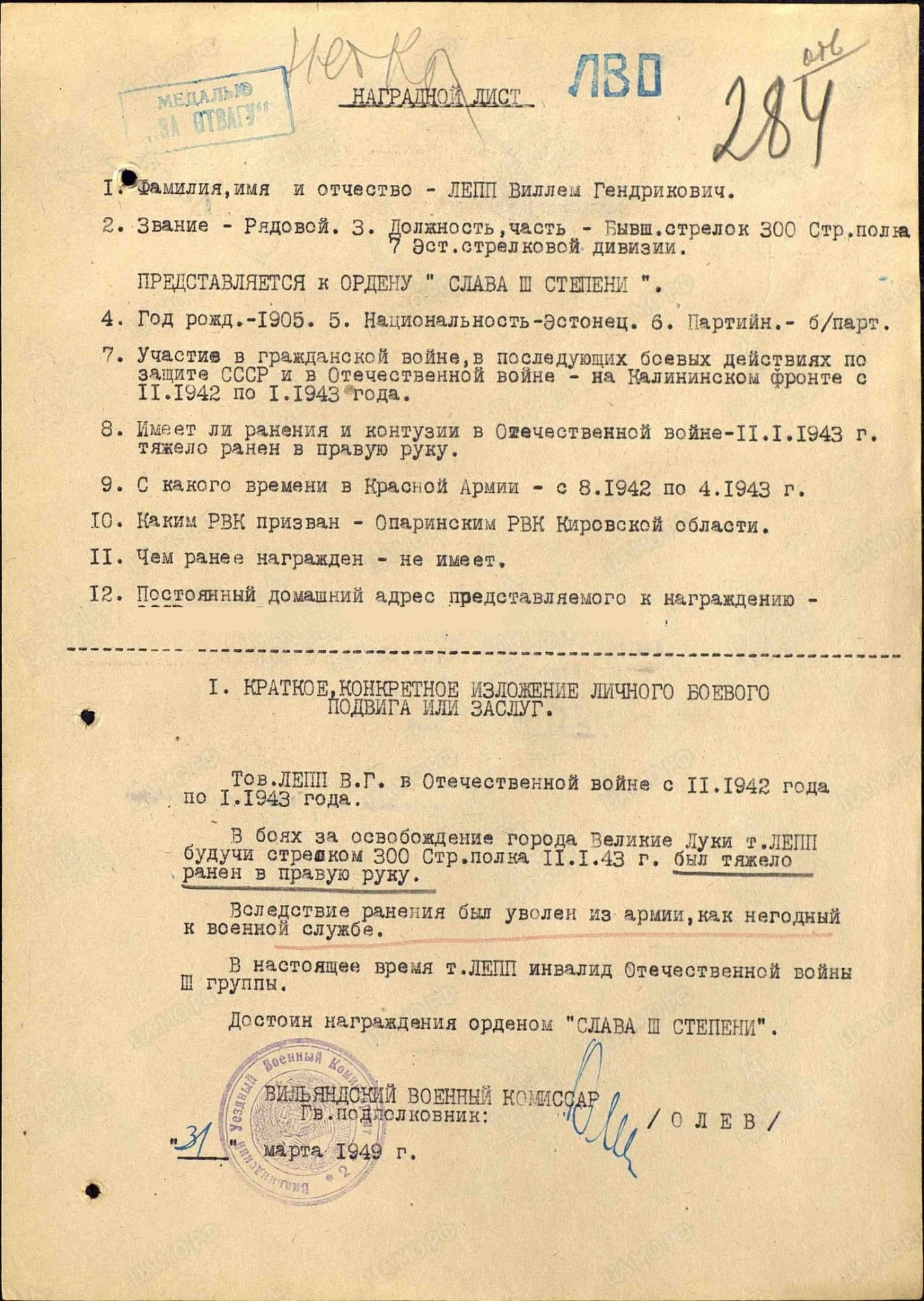 Korpusepoiss Villem Lepp. 7. Eesti laskurdiviis, 300. Laskurpolk. Vapruse medali 3442384 kavaler. Medal on antud raskelt haavata saamise eest Velikije luki lahingus.