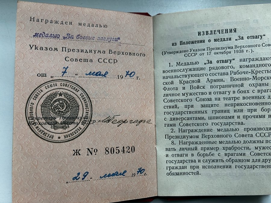 Pildil oleva Vapruse medal (1538568) annetati talle 1944. aasta 8. augustil ja tõlge autasulehelt on nii: