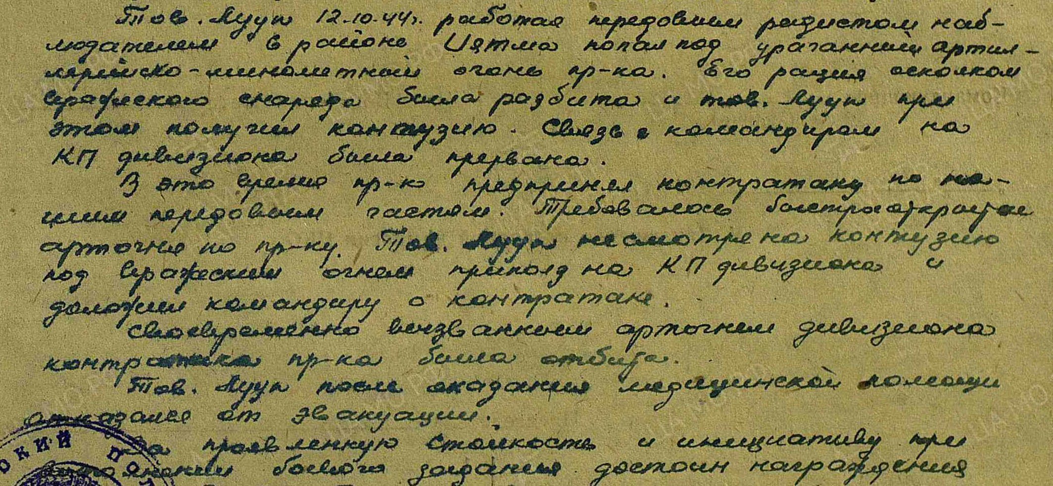 "Seltsimees Luup töötas 12. oktoobril 1944 radistina staabi koosseisus ??? piirkonnas, kui sattus vaenlase tugeva suurtüki- ja miinipildujatule alla. Tema raadiosaatja hävines ning seltsimees Luup sai seejuures põrutuse. Side divisjoni komandöri juhtimispunktiga katkes.
