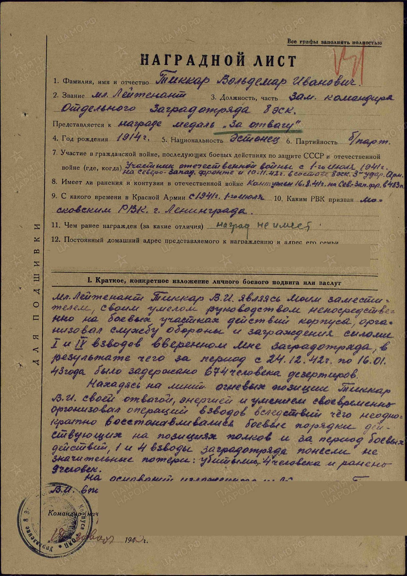 Nooremleitnant Tikkar olles minu asetäitja, moodustas oskuslikult juhtides I ja IV rühma jõudude abiga korpuse lahingulõikudesse kaitse- ja tõkestusteenistuse, mulle ustava tõkestusüksuse, mille tulemusena peeti perioodil 24.12.1942 kuni 16.01.1943.a kinni 674 desertööri.
