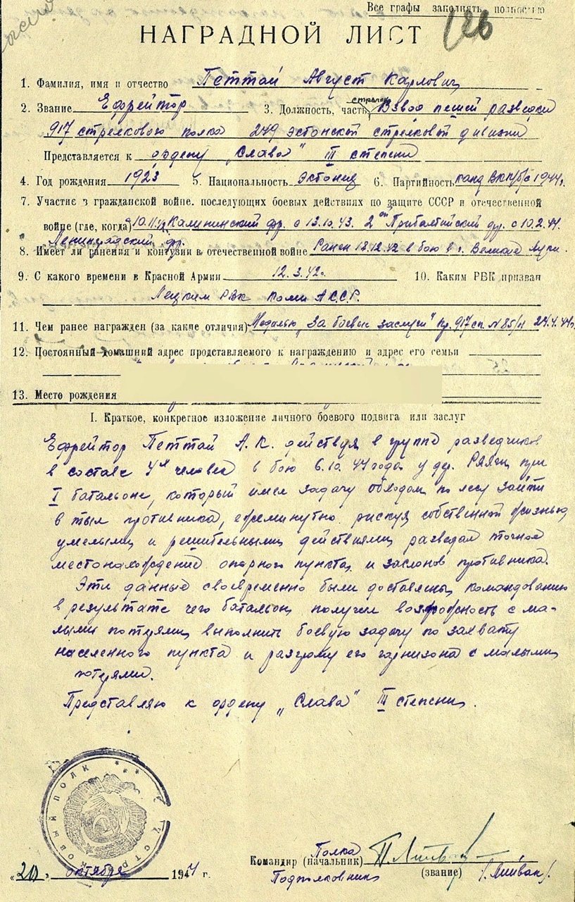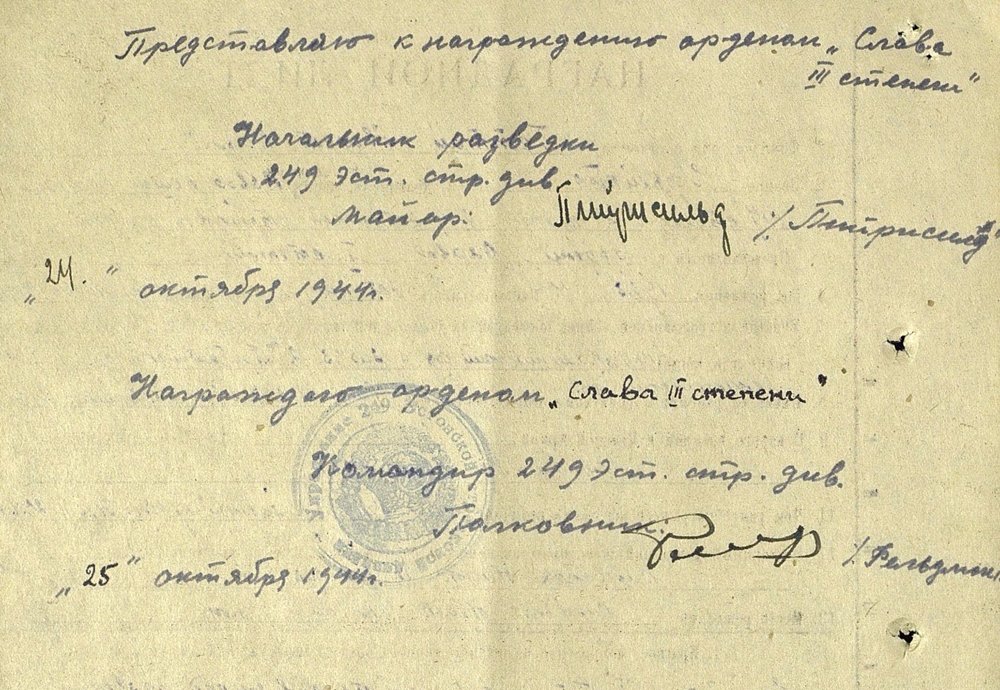 Sai tuvastatud, orden on annetatud Kuramaa lahingute eest 8. ELK'i 7. laskurdiviisi 300. laskurpolgu seersandile Herbert Veersalu'le. Käsikirjas kirjutatud teksti lugemisel ja tõlkimisel jäi ChatGPT hätta ning oleks hea kui keegi tore inimene lühidalt ära tõlgiks, mille eest see talle täpselt annetati.