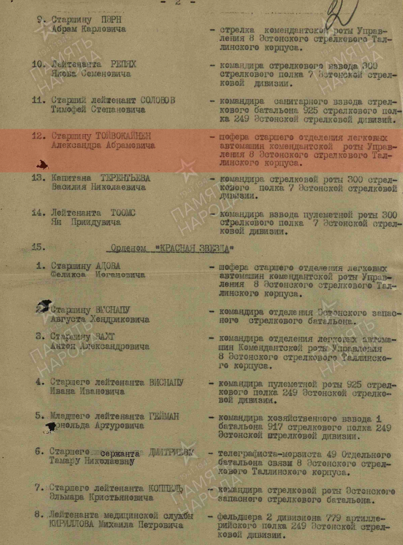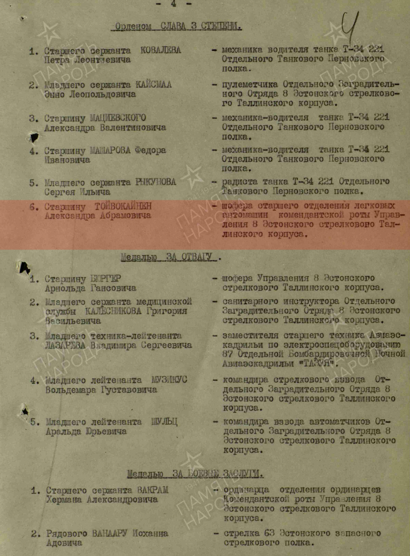Esitati algselt Lahinguteenete medalile, aga sai hoopis Punatähe ordeni.