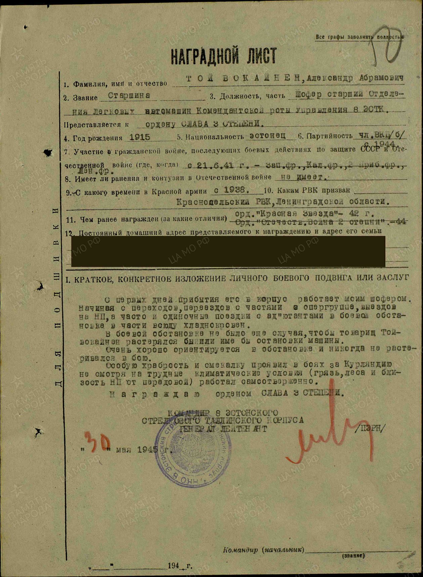 ’’Alates korpusesse saabumisest töötab minu autojuhina. Liikudes üksuste vahel, väljasõitudel vaatluspunktidesse ja tihti ka sõitudel lahinguolukorras üksi või koos adjutantidega käitub alati külmavereliselt. Lahingolukorras pole mitte kordagi sattunud segadusse, selle tõttu pole pidanud auto seisma. Orienteerub olukordades hästi ja lahingolukorras pole mitte kunagi kaotanud pead. Erilist vaprust näitas üles Kuramaal, kus vaatamata sellele, et vaatluspunkt asus eesliini lähedal ja ilmastikuolud olid rasked, töötas alati ennastohverdavalt’’