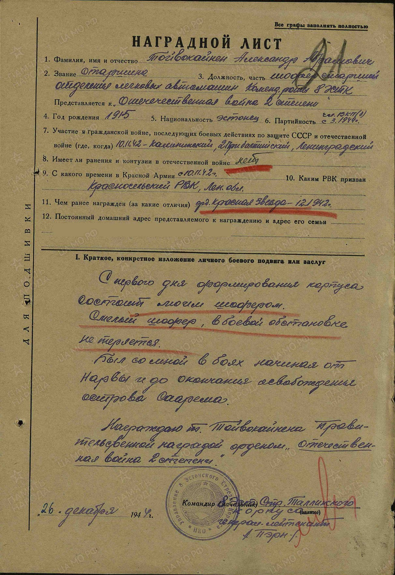 ’’Toivokainen on kogenud ja julge autojuht. Osalenud vastasseisus Hiinaga 1929. aastal. Osalenud sõjas valgesoomlastega ja võitleb sõja esimesest päevast alates saksa okupantide vastu’’.