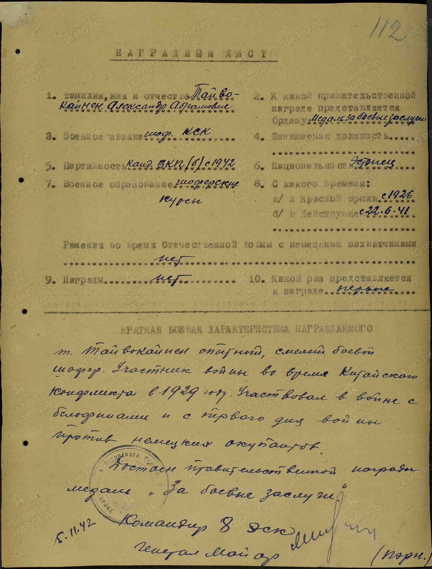 1942. a detsembris autasustatud Punatähe ordeniga, autasulehelt: