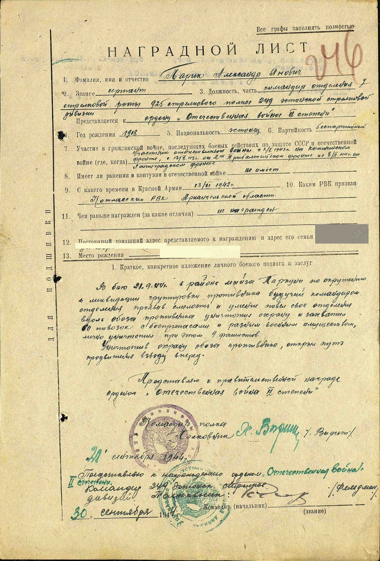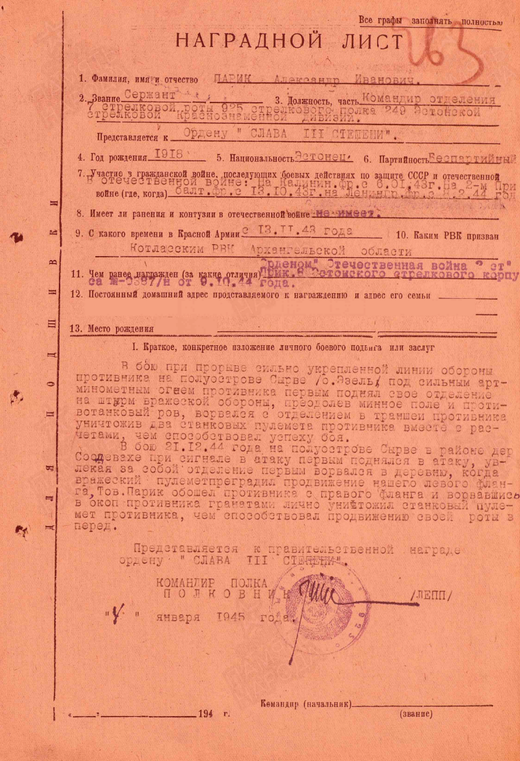 249.laskurdiviisi 925.laskurpolgu 7. laskurroodu jaokomandör, seersant Aleksander Parik. II. Klassi Isamaasõja ordeni nr. 125579 kavaler. Parik sai Saaremaa lahingute eest ka Kuulsuse III klassi ordeni, aga sellest ei tea hetkel midagi.