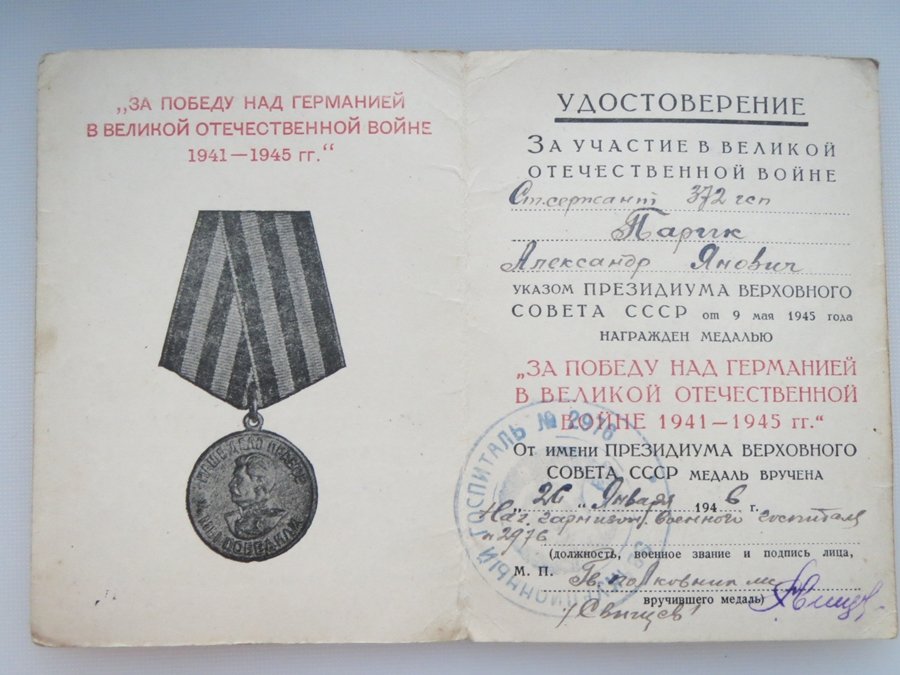 Ei saagi päris täpselt aru, et mis selle ordeniga juhtunud on. Oleks nagu riivamisi pihta saanud ja ’’Võidu eest Saksamaa üle’’ medal ning tunnistus on talle ka garnisoni sõjaväehospidali poolt antud. Et kas sai siis millaski ennem seda näiteks ordenit kandes haavata... ei tea.