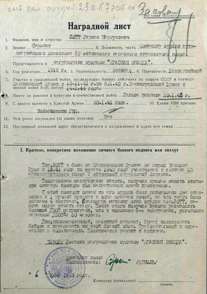 Seersant Herman Lott, Eesti Laskurkorpuse 63. tagavara- laskurpolgu suurtükiväedivisjoni relvakomandör. Vapruse medali kavaler. Ta esitati küll 1945.a Punatähe ordeniga autasustamiseks, aga sai lõpuks Vapruse medali ja sedagi mingil põhjusel alles 1952. aastal.