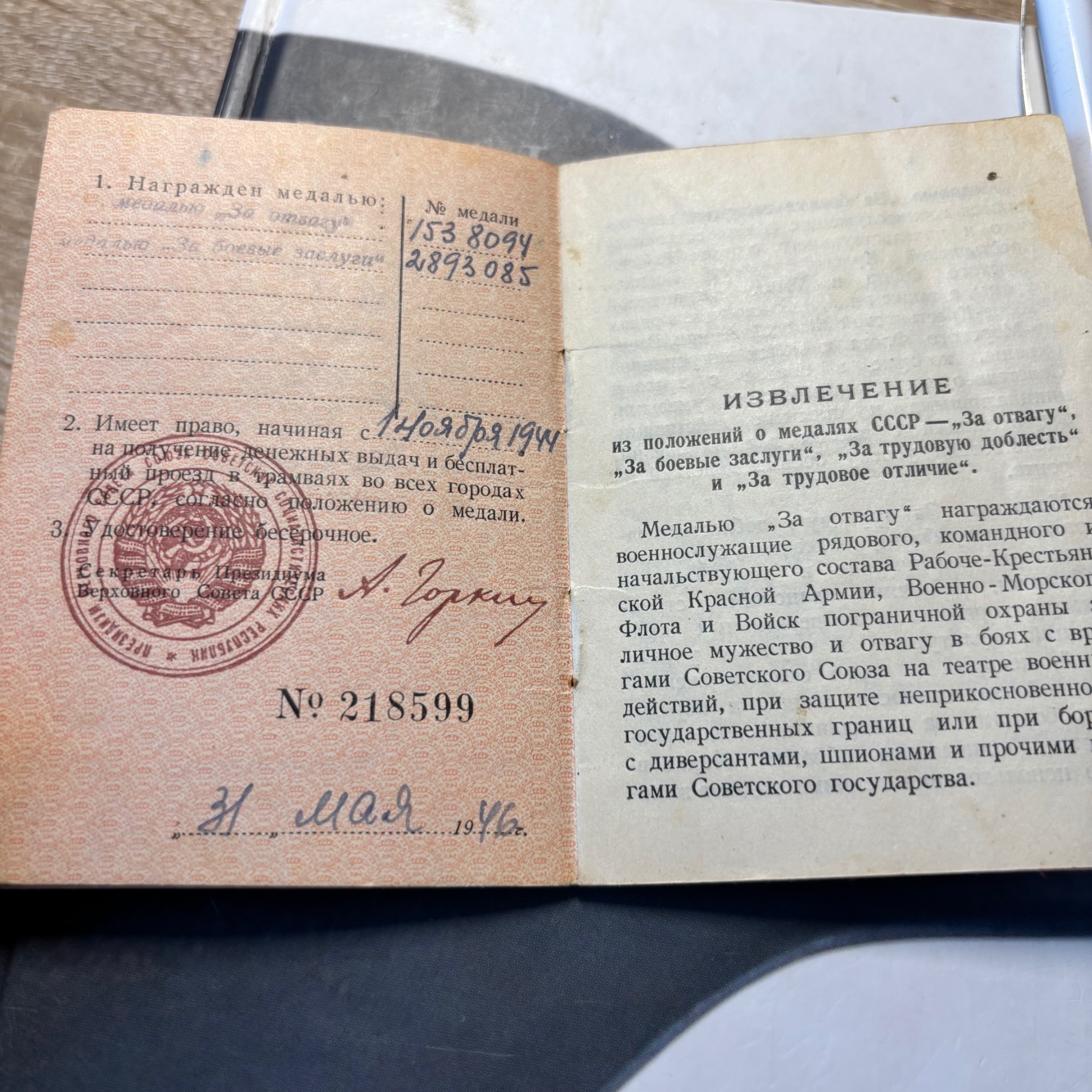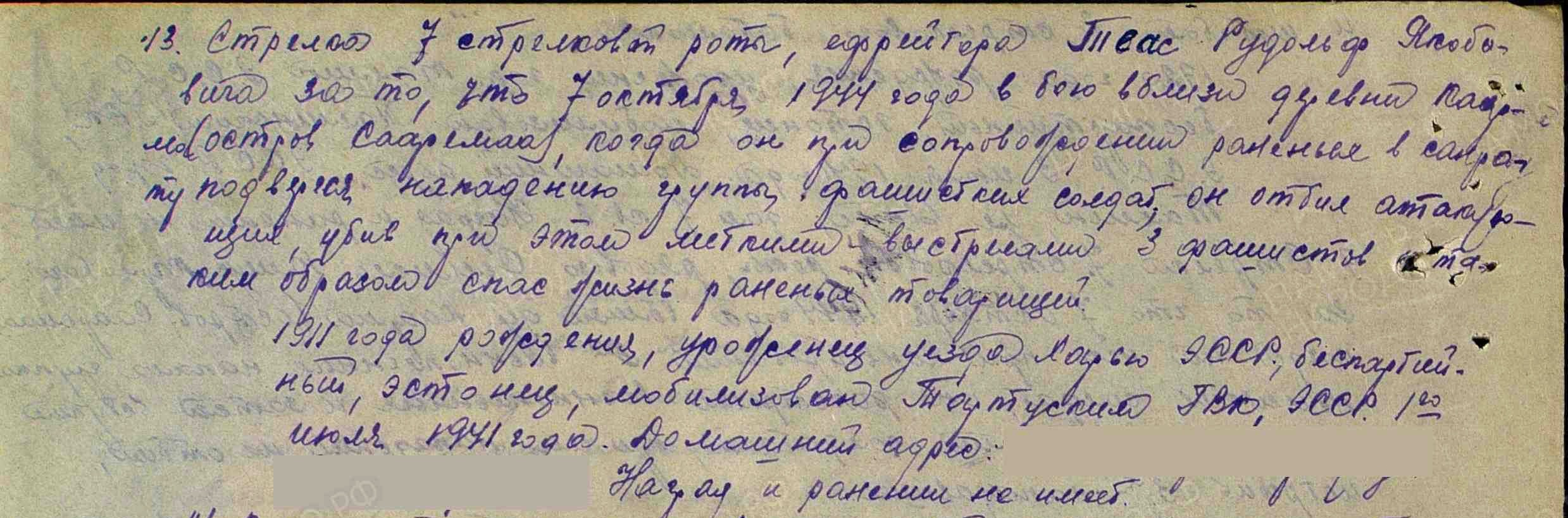 Vapruse medali(1538094) ja lahinguteenete medali(2893085) kavaler. Vapruse medal saadud Saaremaal ja lahinguteenete medal Kuramaal.