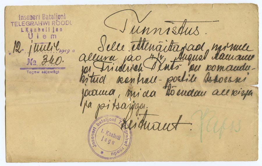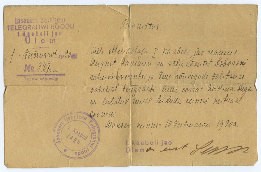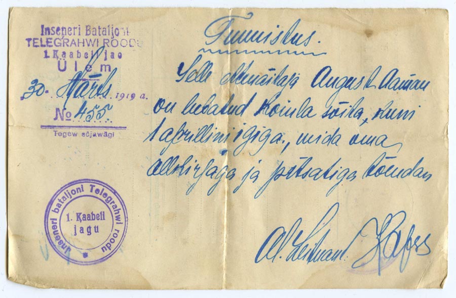 Vabadussõja lõpus August Aamann'ile väljastatud tunnistus, mis tõestab, et ta on lõpetanud kolmekuulised elektrotehnika kursused.