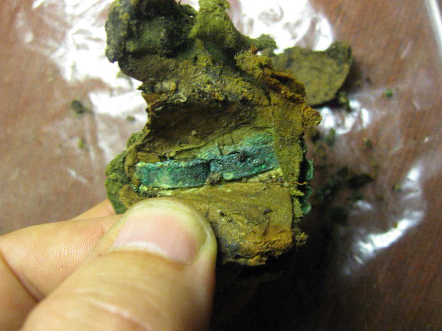 Arnold puhastas mütsimärgi ja kokardi ära. Vertikaalselt jooksis märkide tagant 3,5 cm laiune papptugevdus, horisontaalselt 1,4cm pappriba. Materjaliks oli roheline kalev, märkide telgjoonel oli õmblus: