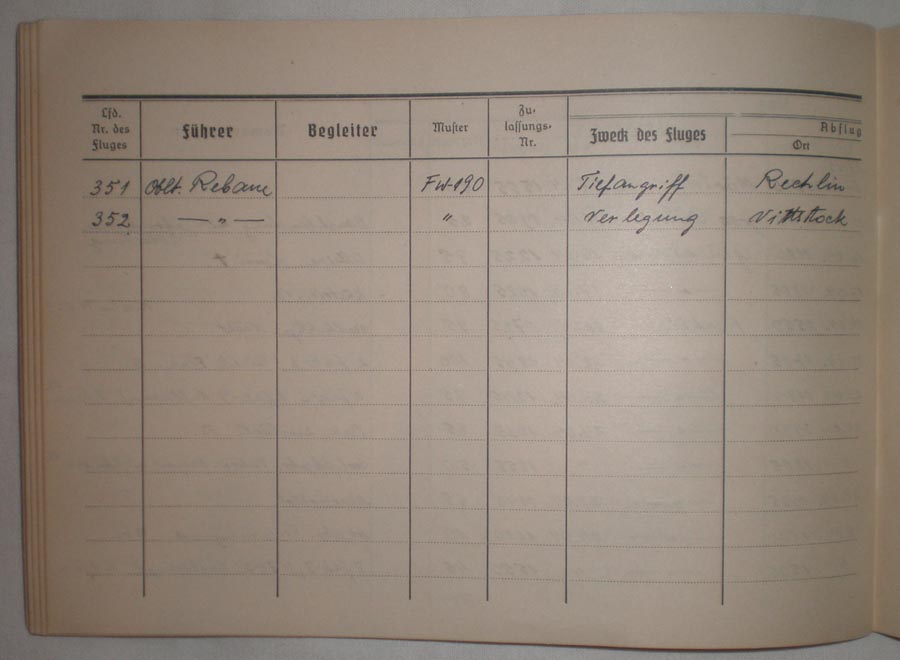 Kokku on sinna märgitud 352 lendu ja viimased 2 sissekannet on 30. aprillist 1945. Sellel päeval oli Rebasel kaks lendu, esimesel lennul sai ta rattad maast lahti kell 10.20 hommikul ja maandus 11.25, lennu iseloomuks on pandud Tiefangriff ja märkmete lahtris on kirjas, et õhulahing nelja Jak-3'ga. Selle päeva teine ja ühtlasi kogu Luftbuch'i viimane sissekanne on tegelikult lend Rootsi, õhkutõusmine 12.10 ja maandumine 13.15 Bulltofta, Rootsi. Selle lennu märkmete lahtrisse on kirjutatud "das Krieg ist zu Ende!".