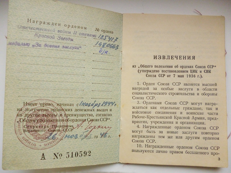 "Za otvagu" nr 2 764... ja "Za bojevõje zaslugi" on numbrita. "Võit Saksamaa üle" medali dokument on allkirjastatud polgukomandör Ilmar Pauli poolt.