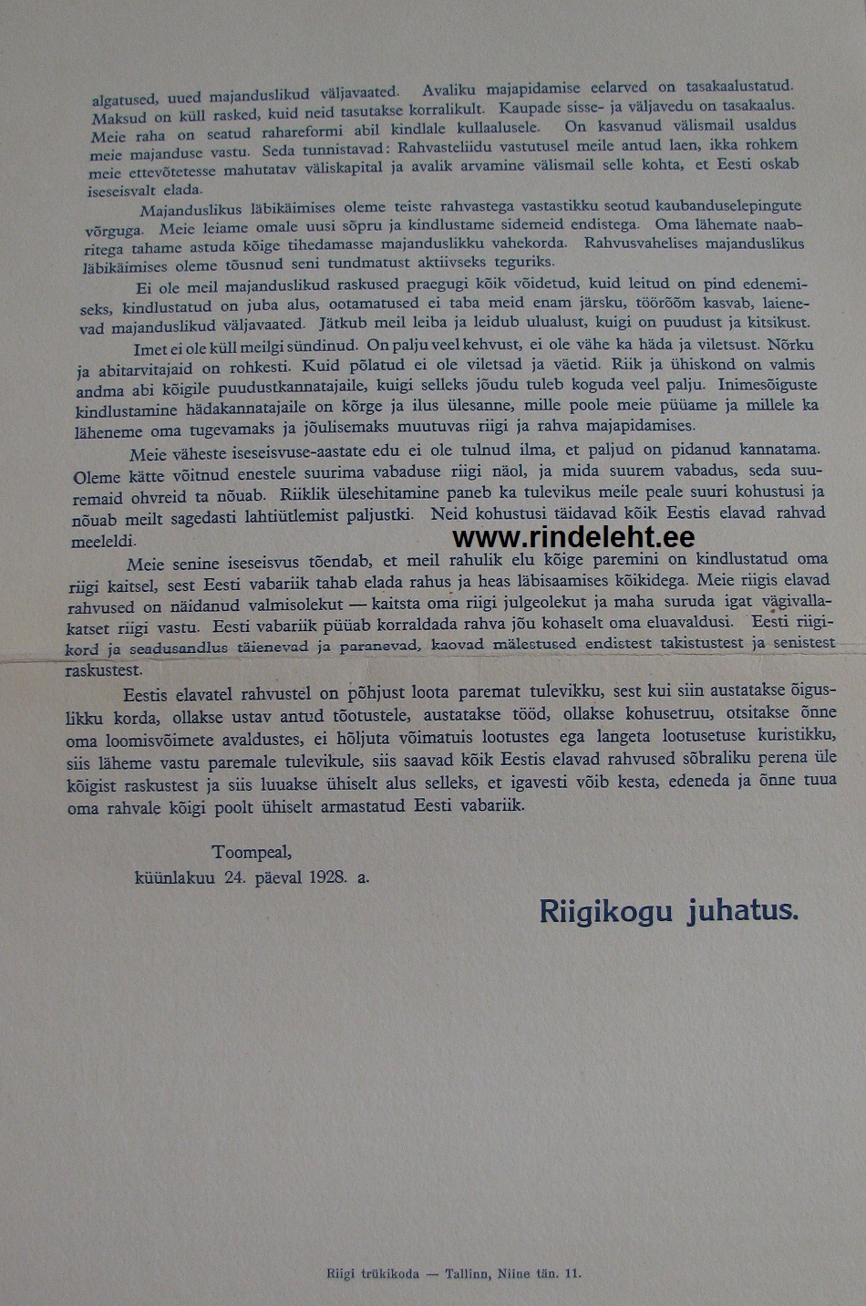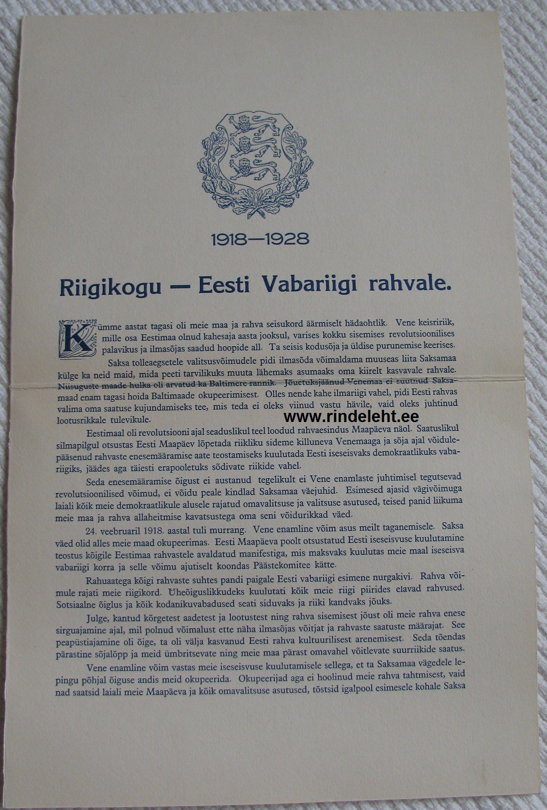 Panen lugemiseks üles Riigikogu 1928. a kõne, mis loeti ette EW 10 aastapäeva puhul üle Eesti erinevatel üritustel. Huvitav lugemine. Kõne tohtis avada alles 24. veebruaril. Lisaks on veel üks ümbrik juhistega.
