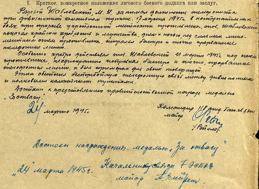 Ja tänane leid Vapruse medali näol. Seerianumbrit vaadates tundus graveering Kuramaa medali reversil tõele vastavat ja tõesti, leidsingi medalil oleva nime järgi otsides omaniku andmebaasist ülesse. Reamees Mihhail Shablovski oli 7. Eesti Punalipulise Laskurdiviisi 118. Üksiku sidepataljoni staabiroodu telefonist. Tagas vaenlase tugeva tule all sideliine korras hoides mitmel korral katkematu side, mille eest saigi autasustatud Vapruse medaliga.